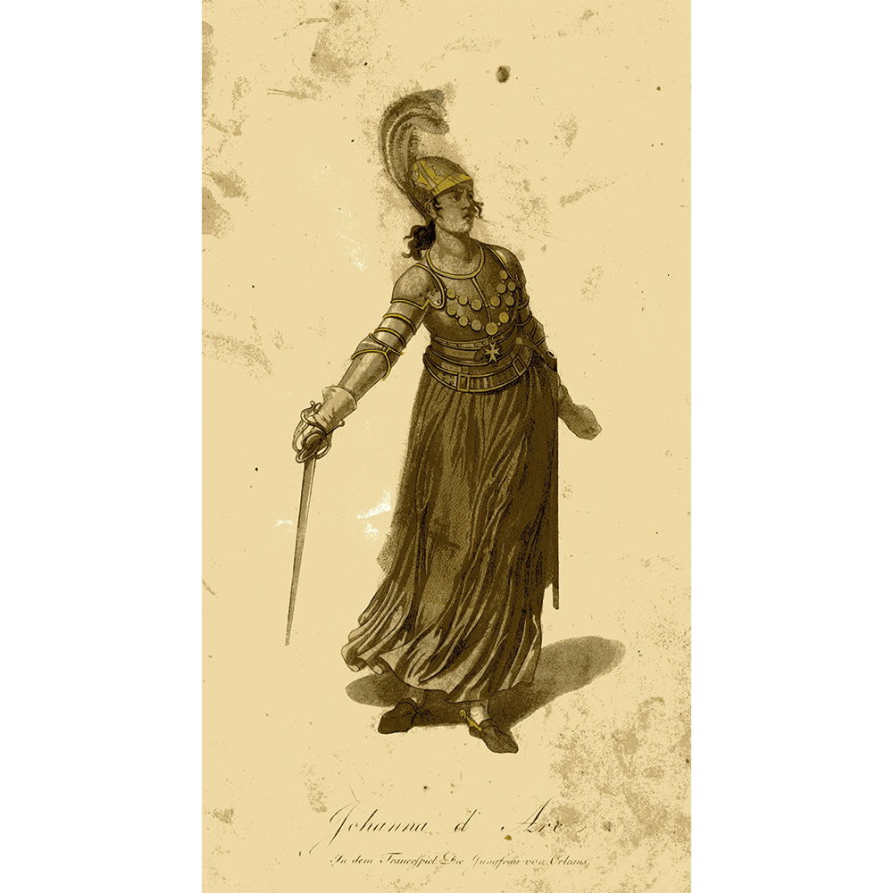 SCHILLER, F. v.: Johanna d'Arc. In dem Trauerspiel: Die Jungfrau von Orleans. [aus]: Kostüme auf dem Kön[iglichen]: Nationaltheater. Koloriertes Aquatinta. [Berlin 1812] 27 x 17 cm. Gebräunt und fleckig.