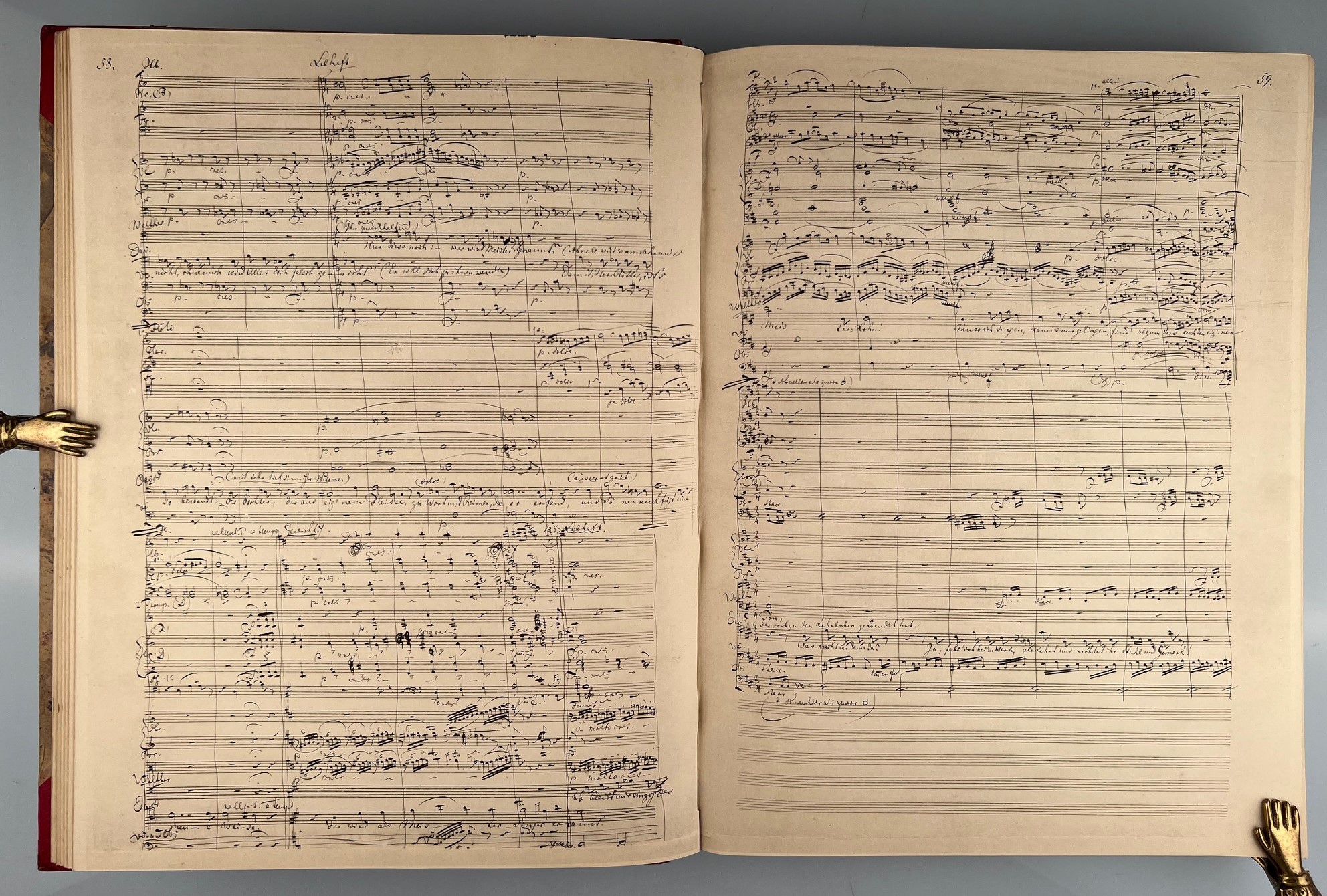 Prachtvolles limitiertes Faksimile, Nr. 223 von 410 gedruckten Exemplarenerschienen ist. "Die beiden verschiedenen Papiersorten entsprechen genau dem Originalmanuskript, das bis Seite 126 auf gelbgetöntem, von Seite 127 ab auf weißem Papier geschrieben ist." - BSB 17, 6869; CPM 59, 34. - Wagners Original-Handschrift, einst seinem König Ludwig II. überreicht, kam 1902 durch Schenkung des bayerischen Prinzregenten Luitpold an das Germanische Nationalmuseum in Nürnberg. Der Druck dieser Faksimile-Ausgabe erfolgte durch die Kunstanstalt Obernetter in München.