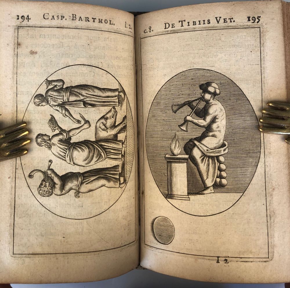 BARTHOLIN, C.: De tibiis veterum, et earum antiquo usu libri tres. Editio altera, figuris auctior. Amsterdam, J. H. Westenius 1679 Duodez. Frontispiz (auf altem Papier faksimiliert), 10 Bl., 5 Kupfertafeln auf 1 gef. Bogen, Holzschnitt-Druckermarke als Titel-Vignette, 415, (5) S., 27 Kupfer im Text, davon 22 ganzseitig. Schweinsleder-Holzdeckel-Band mit reicher Bildpressung und späterem goldgepressten Supralibro. Ohne die Schließen.