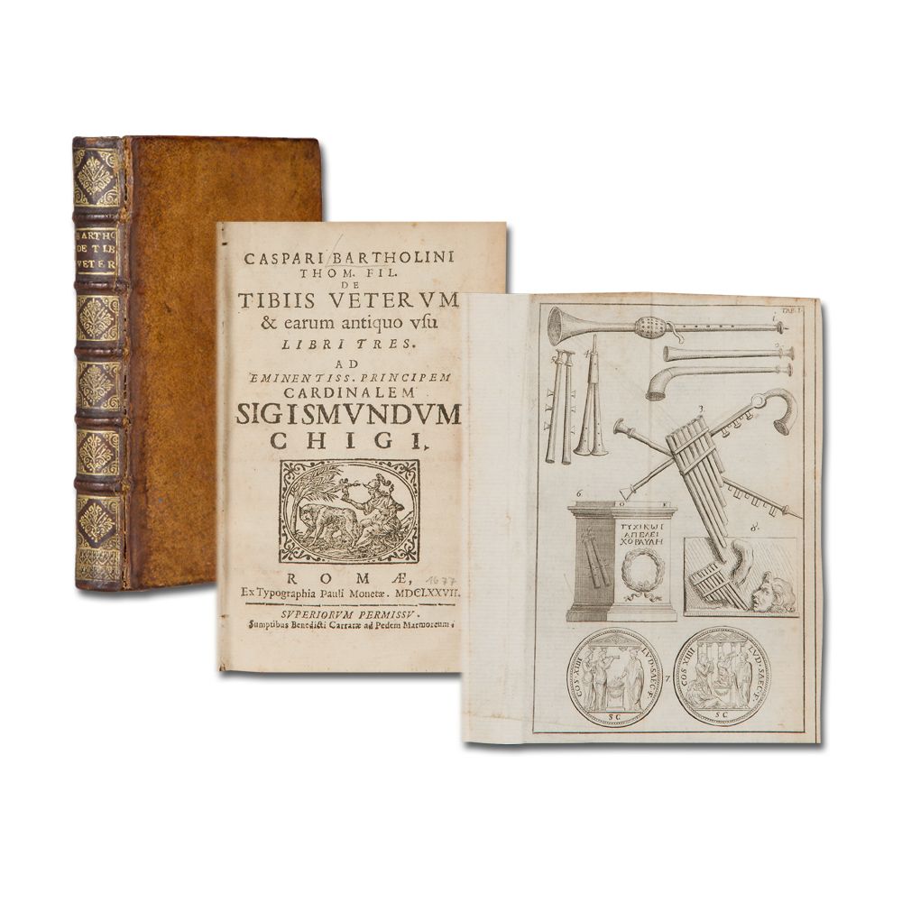 BARTHOLIN, C.: De tibiis veterum & earum antiquo usu libri tres. Rom, P. Moneta 1677. 8 Bl., 235 S., 2 Bl., Holzschnitt-Druckermarke auf dem Titel, 3 gefaltete Kupfertafeln. Einige Blatt leicht gebräunt. Kalblederband der Zeit mit reicher ornamentaler Rückenvergoldung und Stehkantenvergoldung. Vorderes Rückengelenk angebrochen. Restauriert.