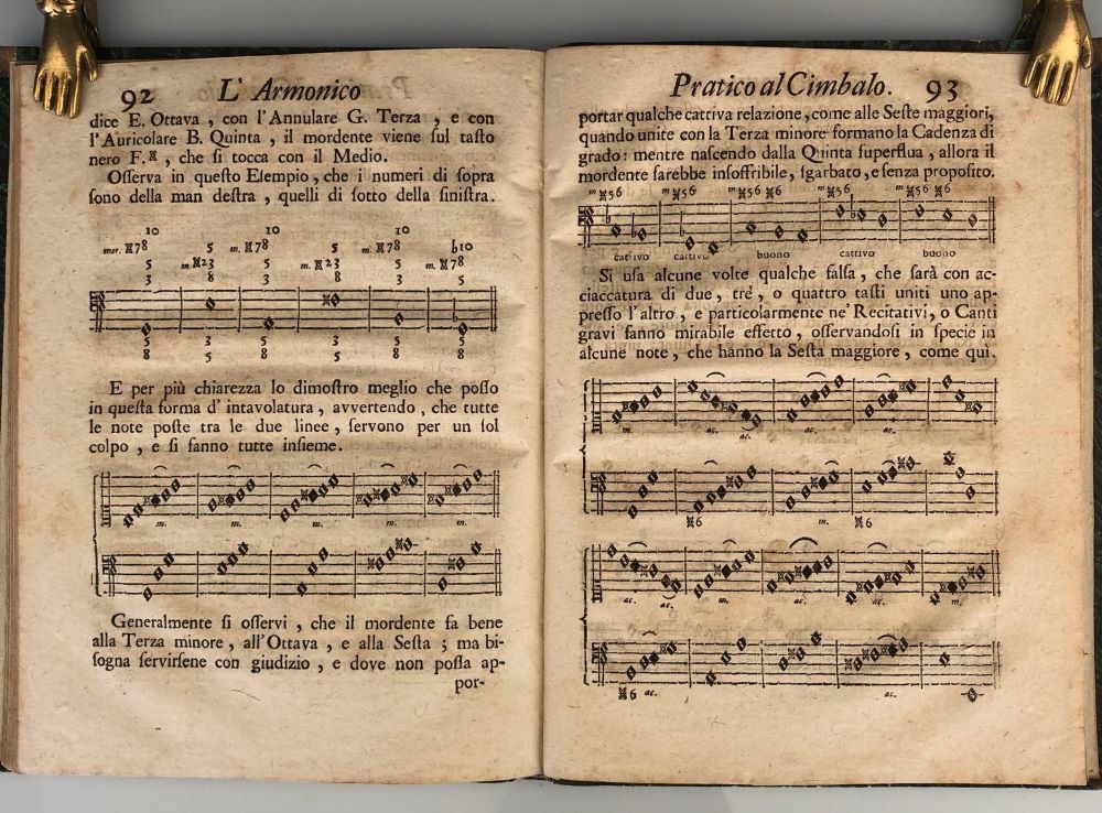 GASPARINI, F.: L'Armonico pratico al cimbalo. Regole. Osservazioni, ed Avvertimenti per ben suonare il Basso, e accompagnare sopra il Cimbalo, Spinetta, ed Organo. Venezia, A. Bortoli 1708 Quart. 118 S., 1 Bl. (teilweise braunfleckig bzw. schwach wasserrandig), 1 Holzschnitt-Vignette, zahlreiche Noten in Holzschnitt-Typendruck (Titel mit Spur eines entfernten Stempels, hier kleine Fehlstelle fachgerecht hinterlegt) Schöner Halblederband Mitte 19.Jh. mit grünen marmorierten Deckeln und Rückenvergoldung, leicht berieben und Ecken bestoßen