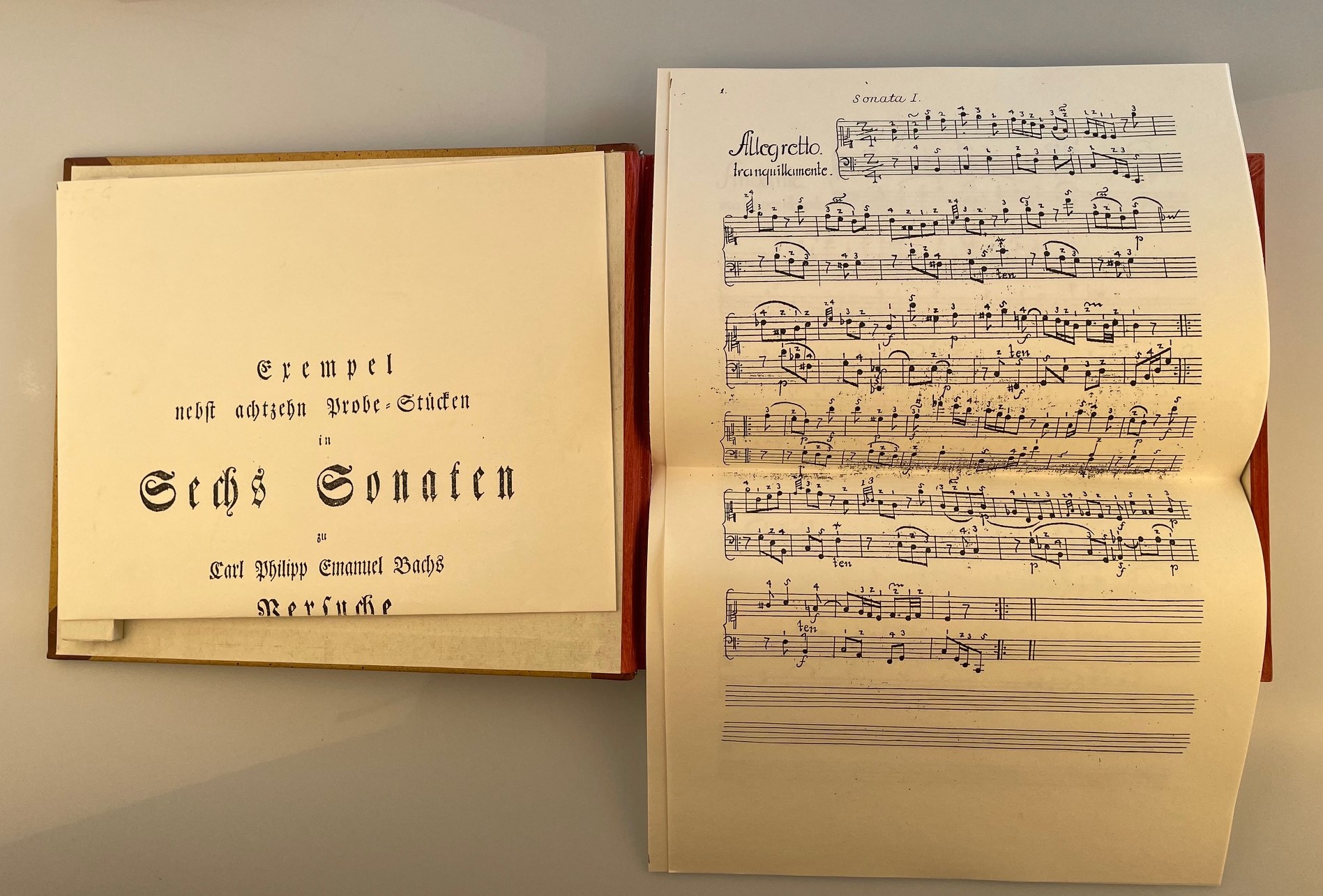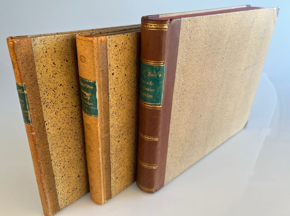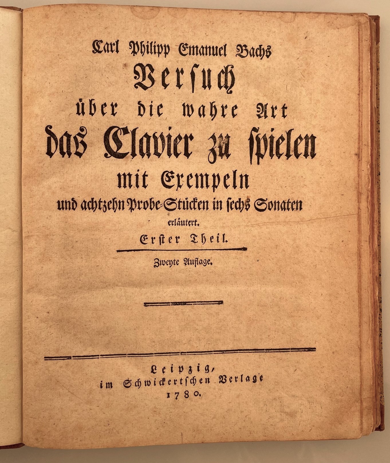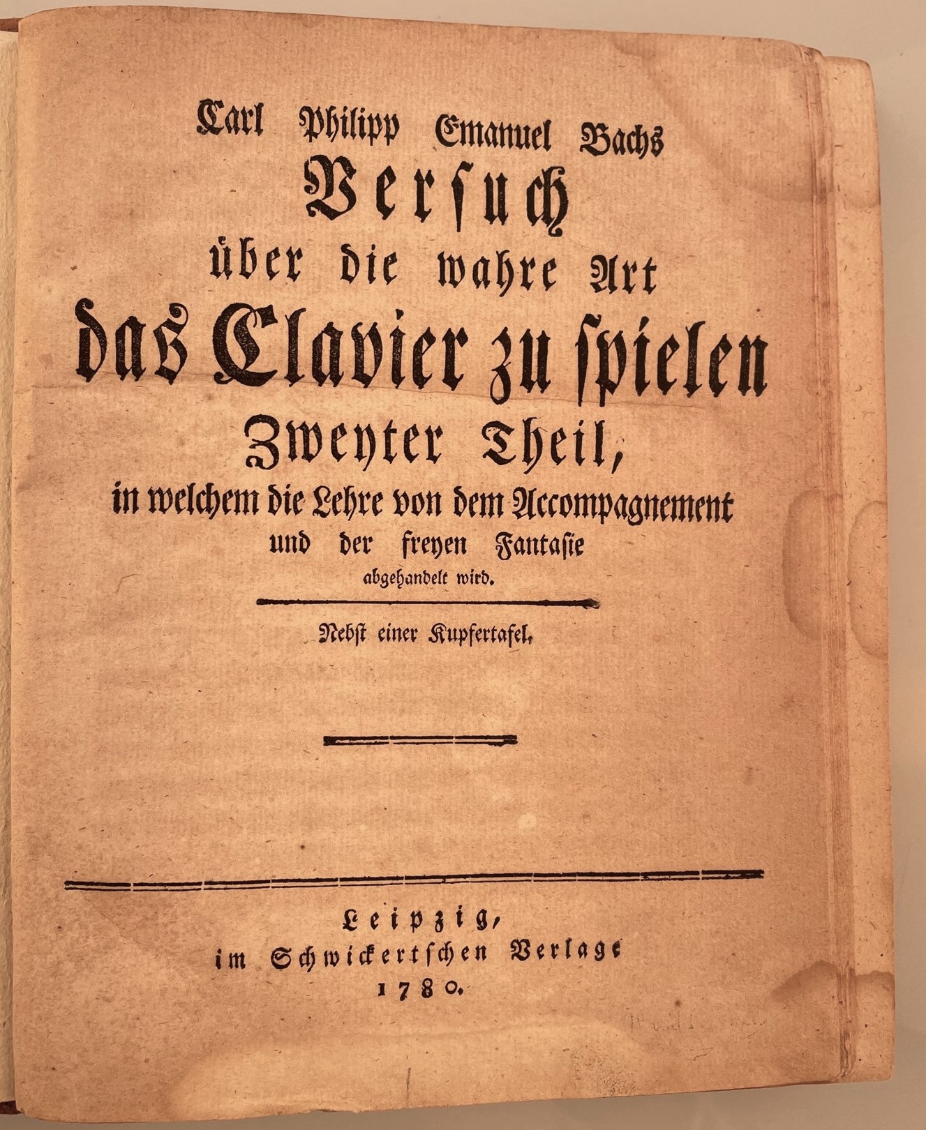 BACH, C. Ph. E.: Versuch über die wahre Art das Clavier zu spielen mit Exempeln und achtzehn Probe-Stücken in sechs Sonaten erläutert. Erster Theil, Zweyte Auflage und Zweyter Theil. Enclosed: Exempel nebst achtzehn Probe-Stücken in Sechs Sonaten ... mit sechs neuen Klavierstücken vermehrt auf XXXI. Kupfer-Tafeln Zweyte Auflage. 2 Teile und 31 Kupfertafeln (Notenteil). Leipzig, Schwickert 1780 Quarto. 4 ff, 118 pp.; 5 ff, 341 pp., 4 woodcut vignettes in the text, 1 folded plate of music. Vol. 2 with some waterstaining at the margin. Part of "Exempel: title, 25 pp. Sonatas, 6 pp. plates, all in facsimile on matching paper. Nice half leather binding and half leather case in the style of the time.