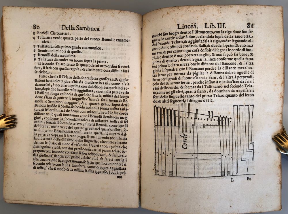 COLONNA, Fabio: La Sambuca lincea overo dell'istromento musico perfetto lib.III. Neapel C. Vitale 1618 Klein-Quart. 4 Bl. (Gestochener Titel, 2 Bl. Widmung und 1 Bl mit gestochenes Porträt Coronas), 116 S., zahlreiche Textholzschnitte-und Initialen im Text, sowie zahlreiche Notenbeispiele und Tabellen in Typendruck. Teils gebräunt. Eintrag von alter Hand auf dem Titelblatt. 2 Bl. am unteren Blattrand mit fast vollständig gelöschtem Besitzvermerk, dadurch kleine Papierdefekte. Flexibler Pergamentband der Zeit. Fehlstellen am Rücken sauber hinterlegt.