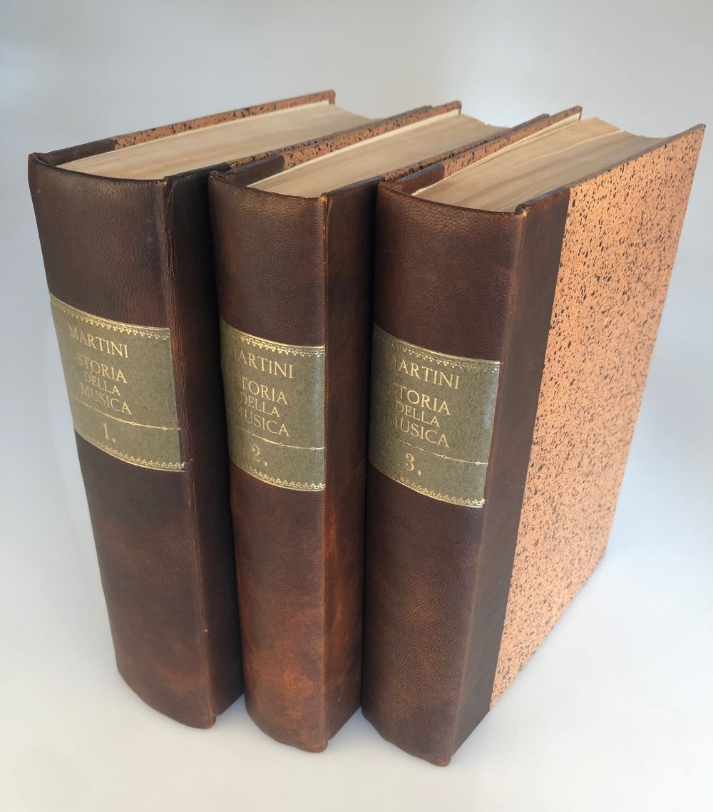 MARTINI, G.: Storia della musica ... 3 vol. Bologna, L. dalla Volpe 1757-81 Quarto. XII, 507 pp, 3 engraved plates, 6 folding plates; XII, XX, 375 pp, 2 geographic folding plates, 2 folding plates; pp III-XX, 459 pp, 3 plates, numerous engraved vignettes in text. Some pages a little bit foxed. Half leather bindings in the style of the time.