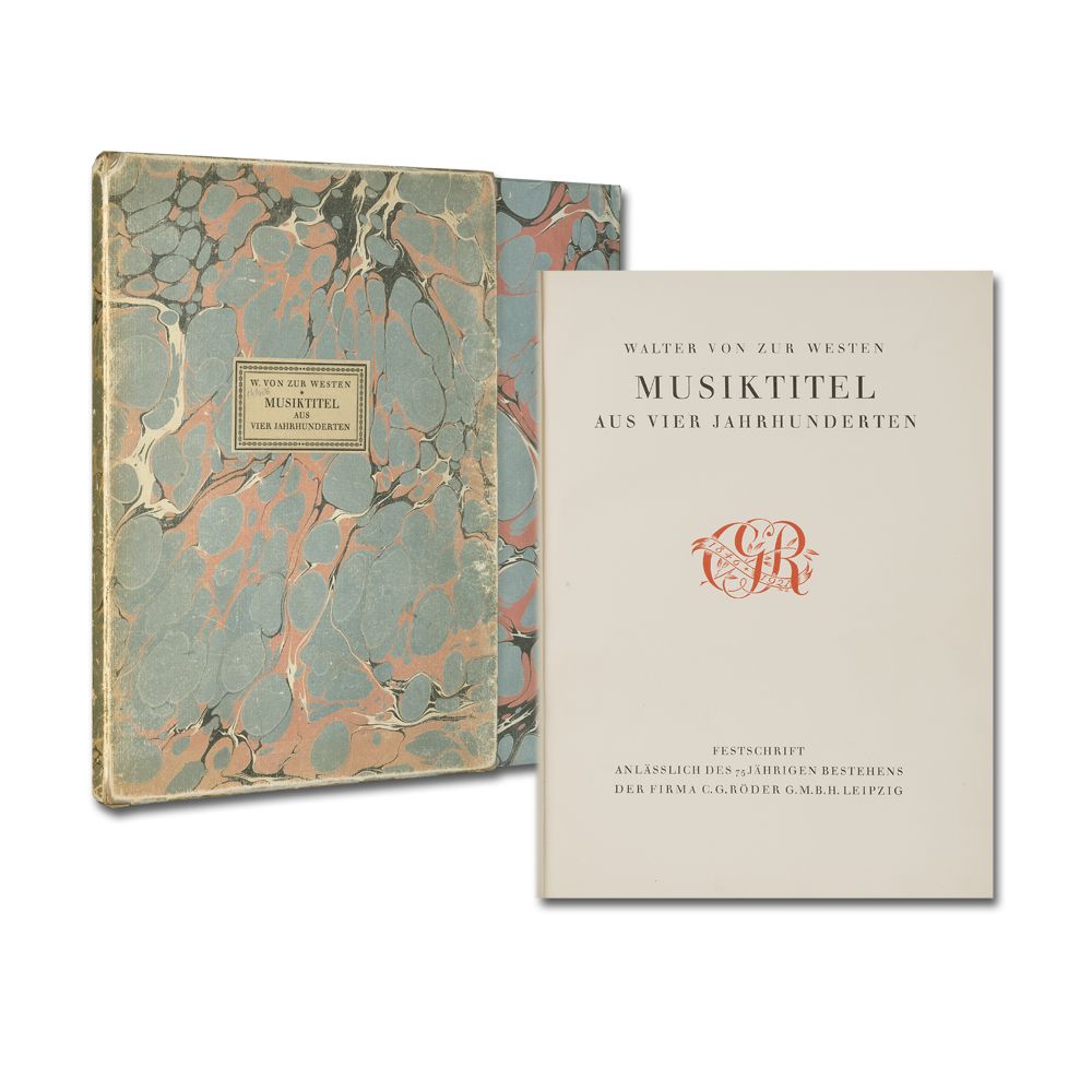 Wichtiges Werk über ein wenig beachtetes, reizvolles Sammelgebiet: die bildliche Darstellung auf Titelblättern von Musikalien. Luxuriöse Festschrift der Notendruckerei C.G. Röder.