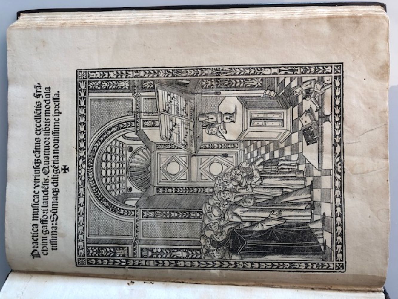 GAFURIUS, F.: Practica musicae utriusqz ca(n)tus excelletis Franchini gafforilaude(n)sis. Quattuor libris modula/ tissima ... (Venedig, Agostino Zanni 1512) Quart. 82 num. Bl., 3 ganzseitige Holzschnitte, sowie zahlreiche Notenbeispiele in Holzschnitt. Titelblatt mit kleiner Fehlstelle am unteren Blattrand, hinterlegt. Letztes Blatt mit 3 Fehlstellen (ohne Textverlust), hinterlegt. Teils finger-bzw. leicht stockfleckig. Wenige Blatt mit kleinen Randläsuren. Moderner blindgepresster Lederband im Stil der Zeit.
