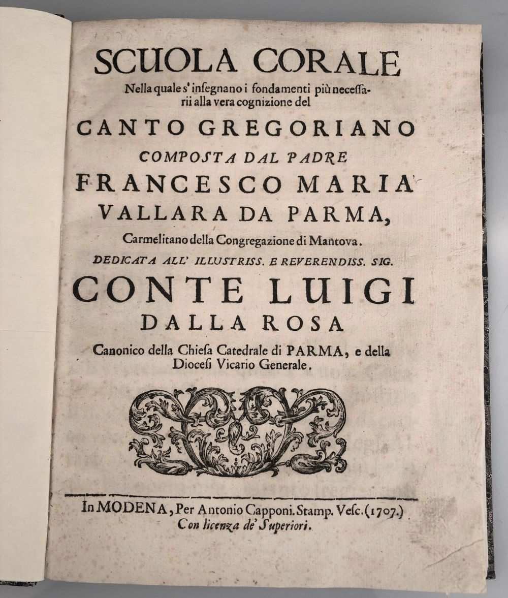 VALLARA, F. M.: Scuola Corale nella quale s'insegnano i fondamenti più necessarii alla vera cognizione del Canto Gregoriano composta .... Modena A. Capponi 1707 Quart. VIII, 198 S., 1 Bl., 1 Kupfertafel im Text. Pappband.