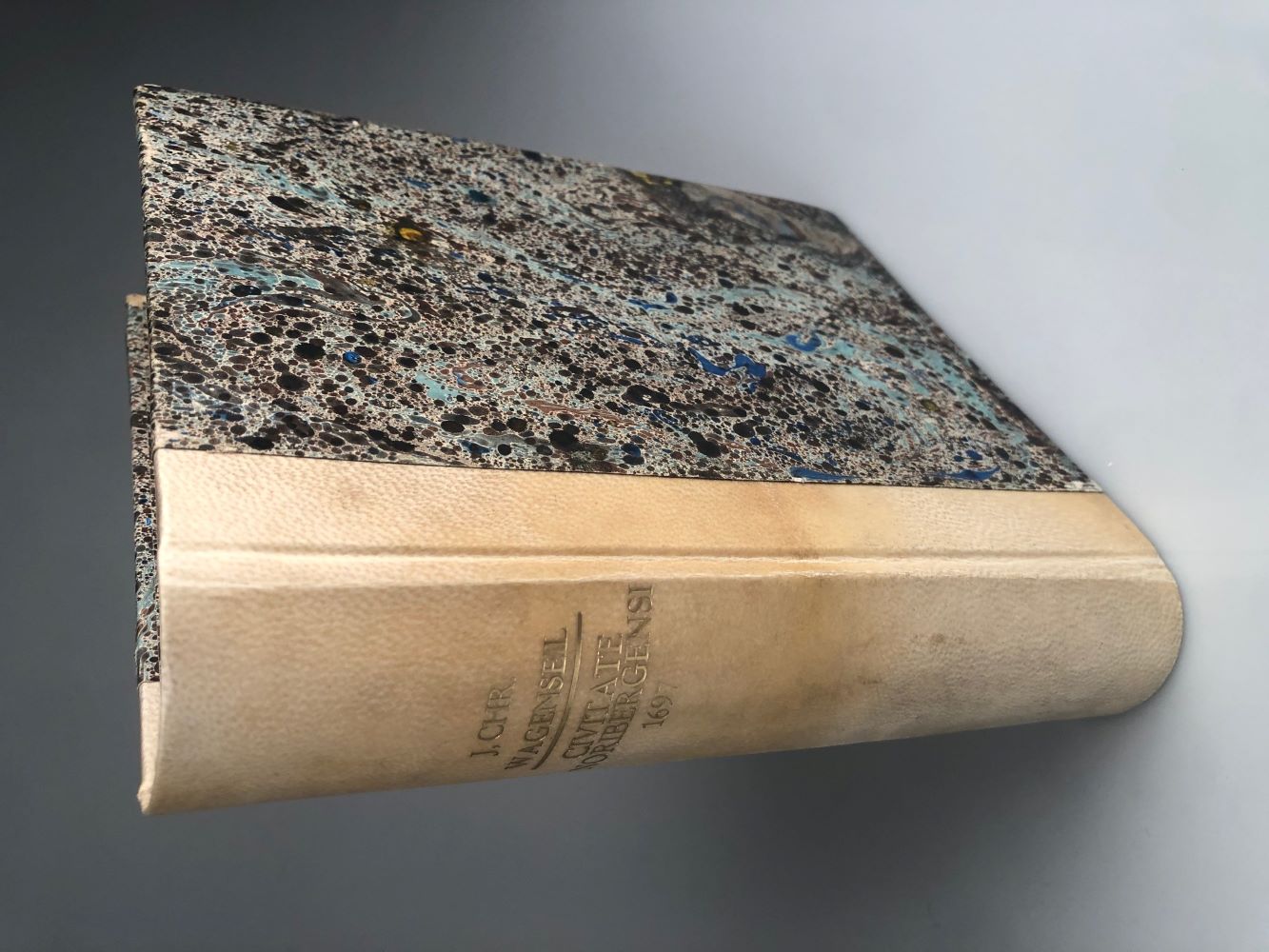 WAGENSEIL, J. Chr.: De Sacri Rom. Imperii Libera Civitate Noribergensi Commentatio. Accedit, de Germaniae Phonascorum. Von der Meister-Singer Origine, Praestatia, Utilitate, et Institutis, Sermone Vernaculo Liber. Altdorf, J. W. Kohlesius 1697 Quart. Gestochenes Porträt (aufgezogen), Titel in schwarzrot, 576 S. (recte 580), 1 gefalteter gestochener Plan der Stadt Nürnberg, 12 ganzseitige, teils gefaltete Kupfertafeln (davon 1 auf passendem Papier faksimiliert), 4 Kupfervignetten, teilweise mit Ansichten von Nürnberg, 6 Bl. Noten sowie 1 Bl. "Des Wilhelm Webers Bildnis" als Gedicht. Titel gestempelt, 2 Bl. mit kl. Einriss sauber repariert, das Bl. "Privilegium" auf altem Papier faksimiliert. Halbpergamentband im Stil der Zeit.