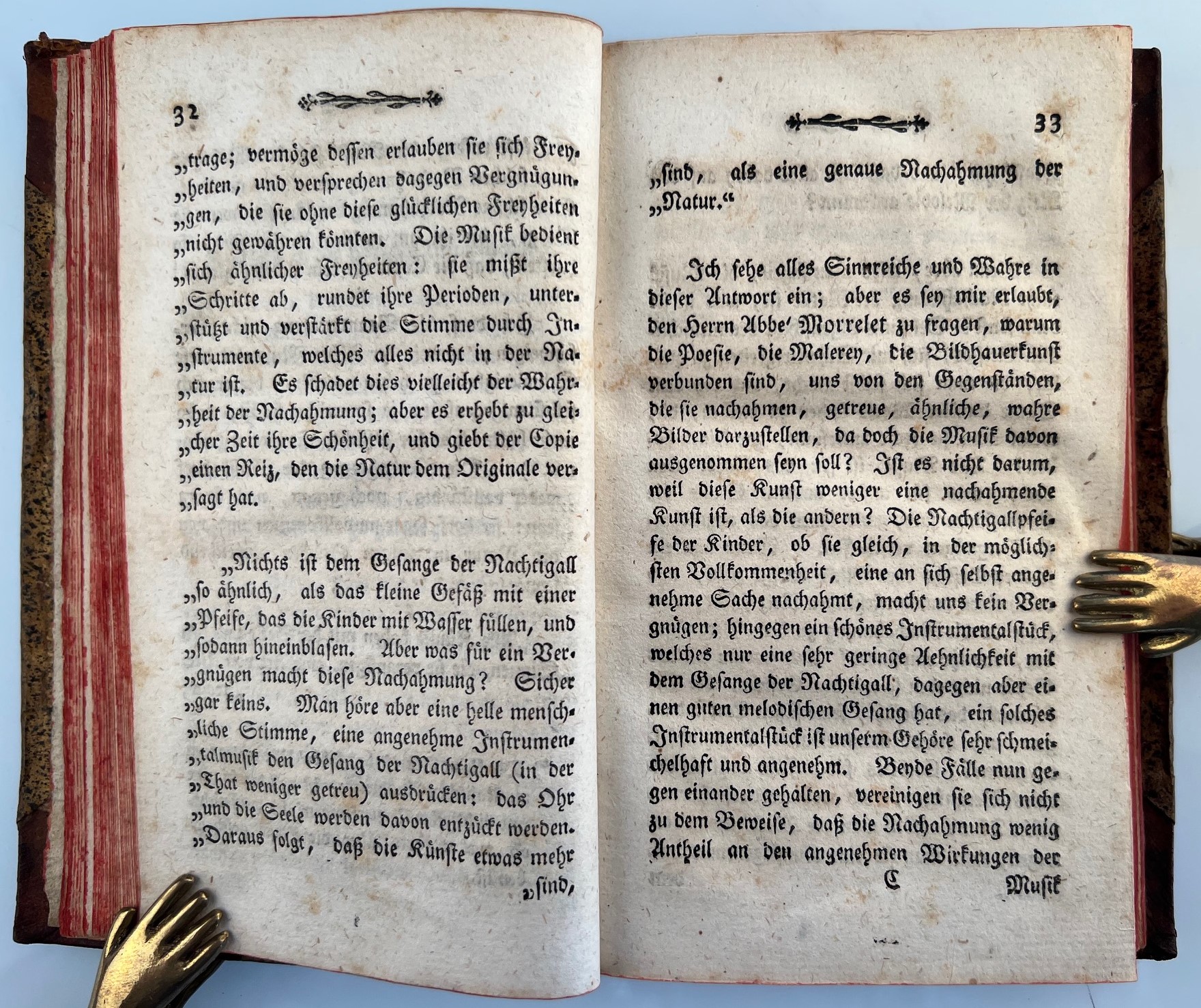 Sehr seltene Erstausgabe. Der bedeutende Gewandhaus-Kapellmeister, Thomaskantor und Musikpädagoge Johann Adam Hiller (1728-1804) widmete diese ästhetische Untersuchung dem Komponisten J. F. Naumann in Dresden. "Nach dem Französischen des Chabanon verfasst" (Wolffheim II, 700). - Wie alle musikästhetischen Schriften Hillers sehr selten. - RISM, Bd. II, S. 415: kein Expl. in USA. Nicht in Cortot. Eitner II, 399 und V, 144; Fétis 329 f.; Grove 11, 512 f.; Hirsch I, 249.