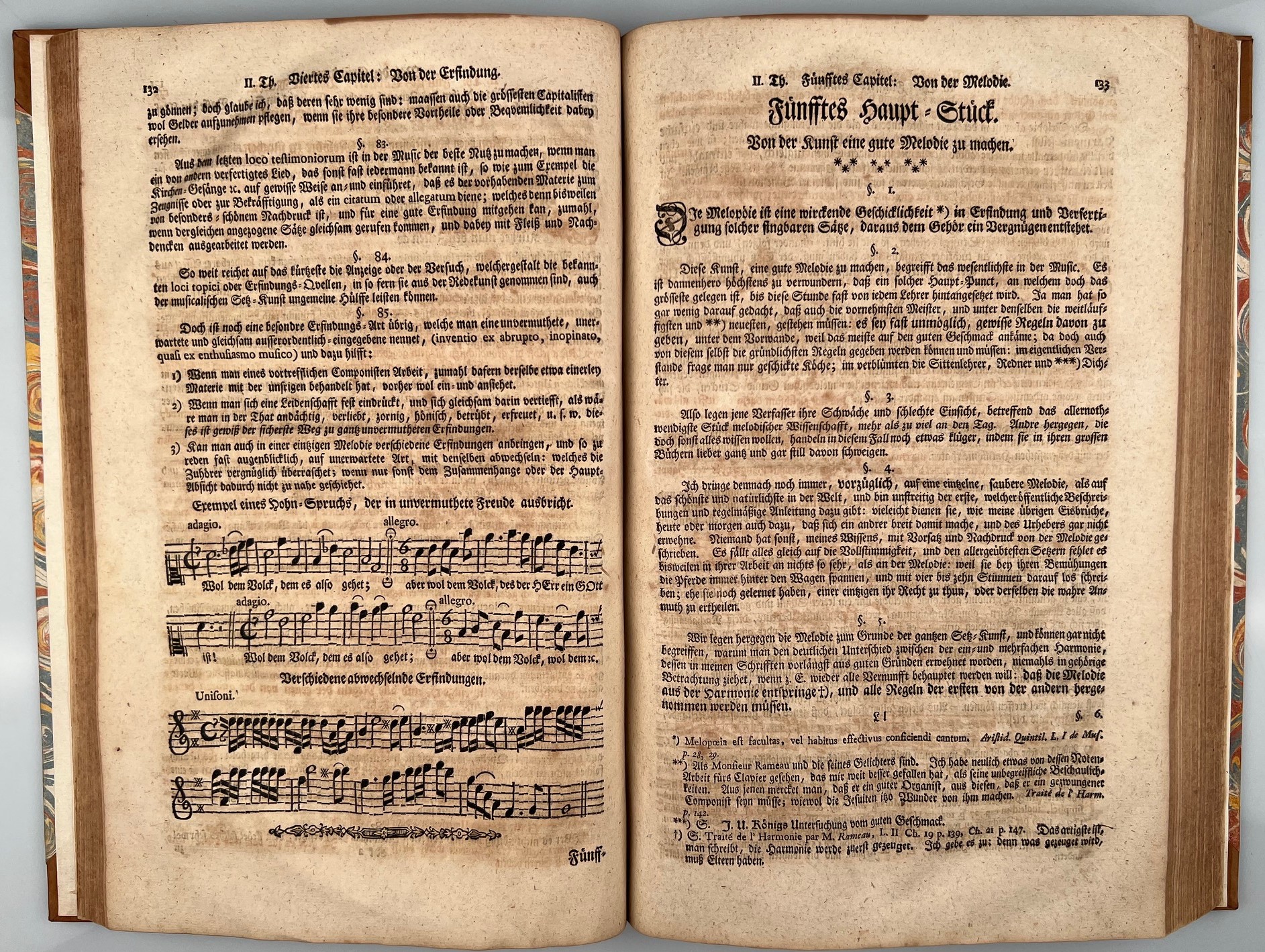 Das wichtigste und umfangreichste theoretische Werk Matthesons, "eine Enzyklopädie der gesamten Musikpraxis seiner Zeit", in der äußerst seltenen Originalausgabe. Behandelt werden die in den 3 "Orchestern", in der "Critica musica", in den beiden "Generalbass-Schulen" sowie im "Kern melodischer Wissenschaft" oft recht knapp abgehandelten, wichtigen Materien aus der Musiktheorie und Ästhetik in ausführlicher Weise, dass dieses Werk geradezu ein grundlegendes genannt werden muss (Schmidt). Matthesons Werke sind zu einer unentbehrlichen Quelle für die Musikwissenschaft geworden, weil ohne sie die grosse musikgeschichtliche Wende, die sich zu seiner Zeit vollzog, schwerlich verstanden werden kann. Joseph Haydn besaß ein Exemplar davon; Goethe kannte es, wie es aus seinem Brief vom 1.1.1819 an Zelter hervorgeht. - Cannon No. 138; Wolffheim I, 819; Hirsch I, 378.