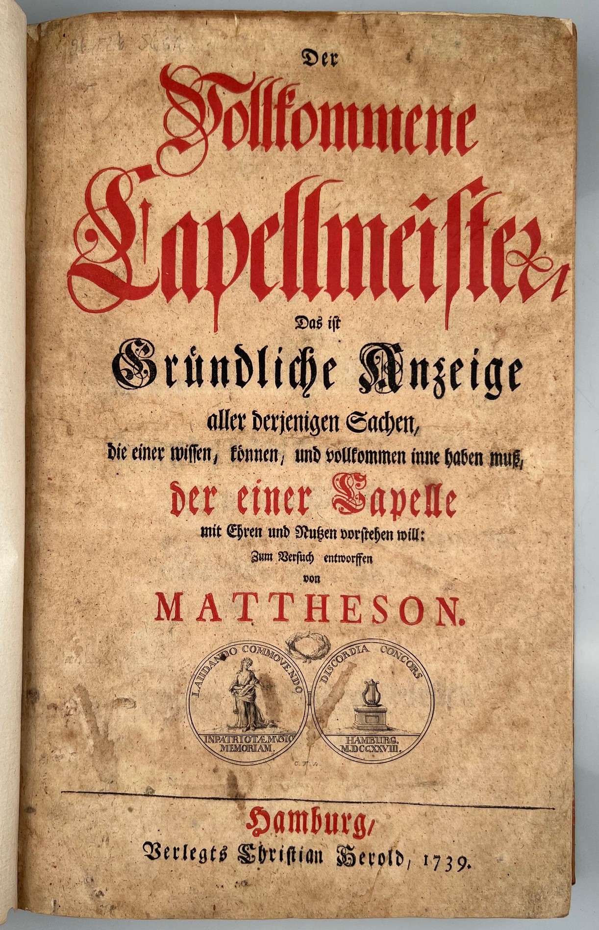 MATTHESON, [J.]: Der Vollkommene Capellmeister. Das ist Gründliche Anzeige aller derjenigen Sachen, die einer wissen, können, und vollkommen inne haben muss, der eine Capelle mit Ehren und Nutzen vorstehen will: Zum Versuch entworffen. Hamburg Christian Herold 1739 Quarto. 28 pp. (incl. title), 2 pp, 484 pp, 11 pp, with engraved title vignette., 1 full-page copperengraving (p. 374) and many music examples in the text. Browned throughout as are almost all copies of this work. The first page of the Emmendada printed twice, but still without "Neues Verzeichnis bisheriger Matthesonischer Wercke", which was facsimiled and bound in as an additional 11th leaf recto.Quart. 28 S. (inkl Titel), 2 Bl., 484 S., 11 Bl., mit gest. Titelvign., 1 ganzseitigem Kupfer (S. 374) und vielen Notenbeispielen im Text. Durchgehend gebräunt wie fast alle Exemplare dieses Werks. Die erste Seite der Emmendada doppelt gedruckt, dafür noch ohne "Neues Verzeichnis bisheriger Matthesonischer Wercke", das als zusätzliches 11. Blatt recto faksimiliert und beigebunden wurde. Beautiful half leather binding in contemporary style with rich period spine gilt and contemporary colored paper.