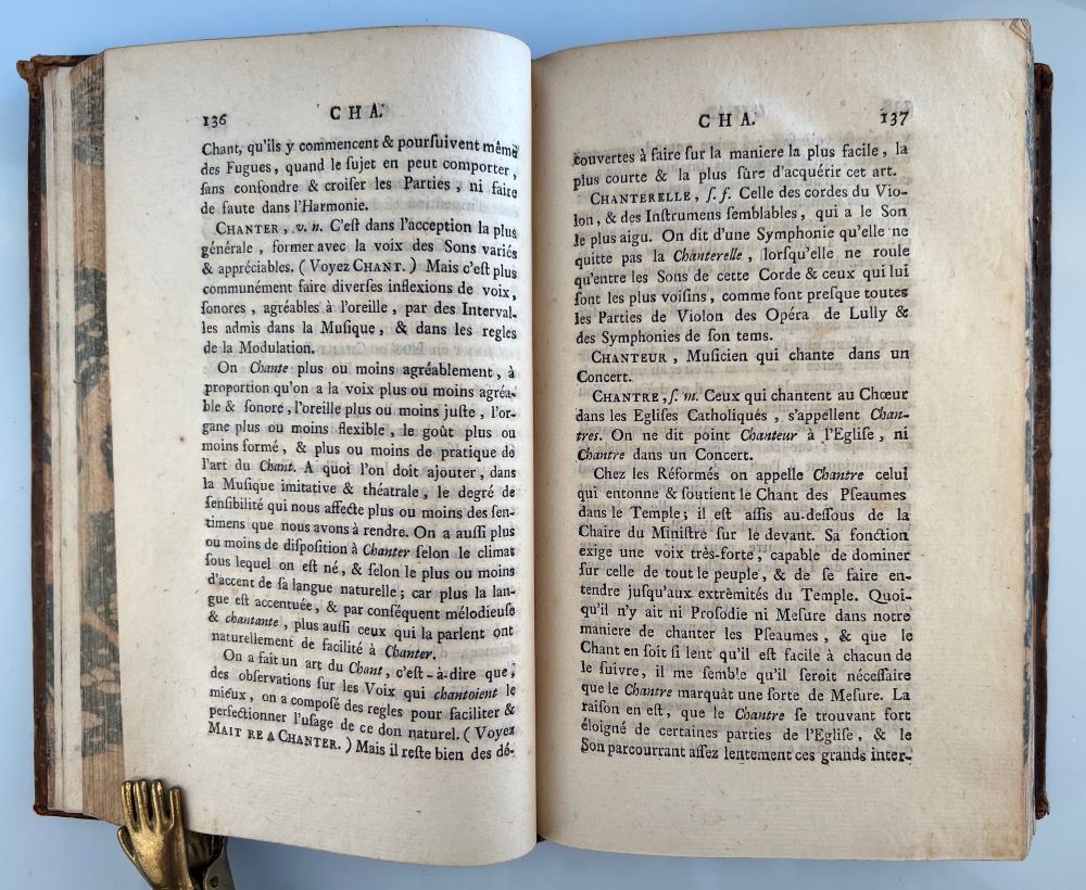 Im Originalverlag erschienene Einzelausgabe des berühmten musikalischen Sachlexikons. "Das Dictionnaire verdient insgesamt grösste Beachtung. Die technischen, mit bemerkenswerter Klarheit geschriebenen Artikel sind eine unersetzliche Fundgrube von Nachrichten über die Aufführungs-Praxis der französischen und italienischen Musik seiner Zeit. Viele klassische Definitionen, die in gegenwärtig noch verwendeten Gesangsschulen und Lehrbüchern erscheinen sind dort zum ersten Mal formuliert worden. Hingegen müssen die ästhetischen und kritischen Artikel mit weit größerer Vorsicht betrachtet werden ... (MGG XI, 1010). - Eitner VIII, 336; Dufour 255.