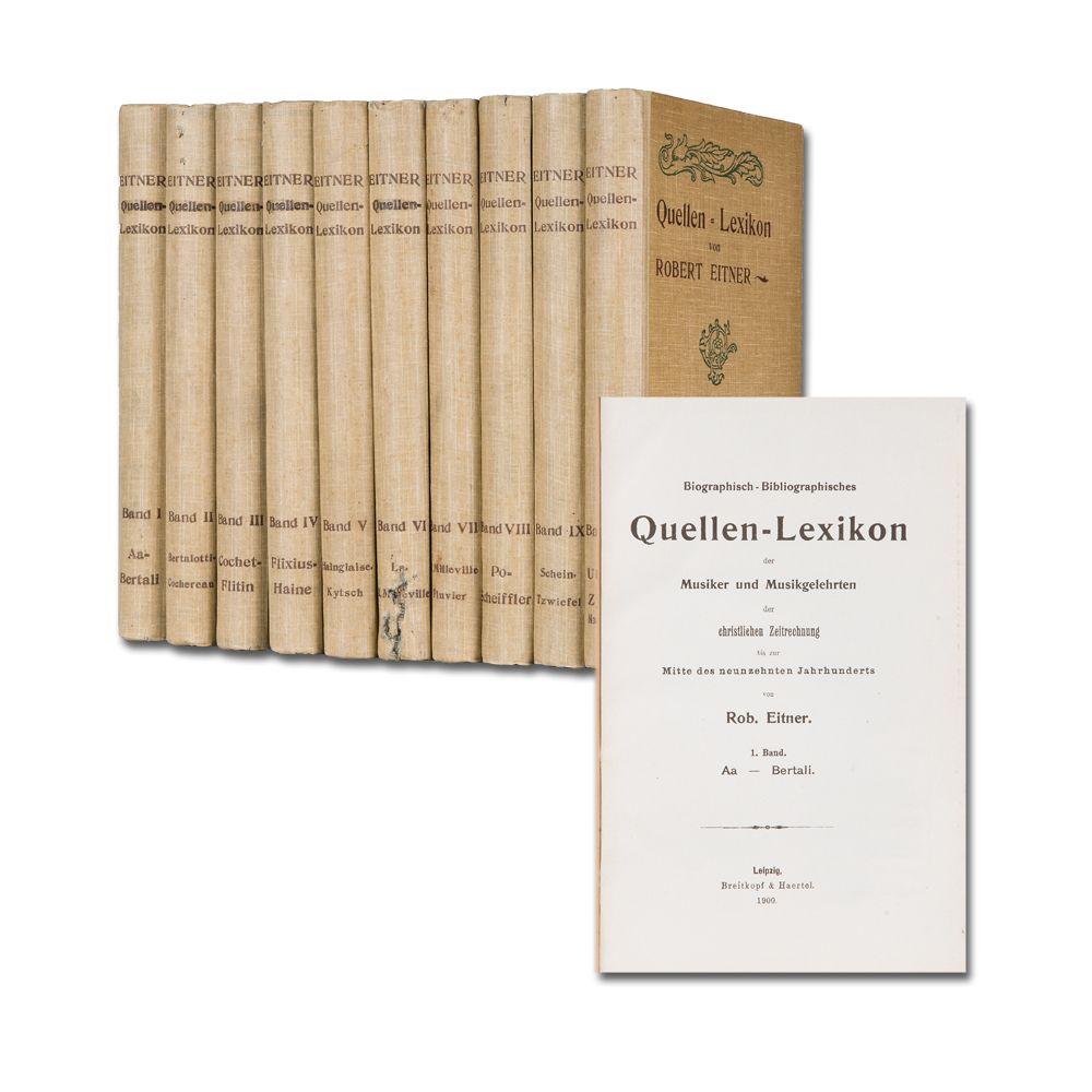 EITNER, R.: Biographisch-Bibilographisches Quellen-Lexikon der Musiker und Musikgelehrten der christl. Zeitrechnung bis zur Mitte des neuzehnten Jahrhunderts. 10 Bände Leipzig Breitkopf & Haertel 1900-1904 Doppelspaltig gedruckt, 1 Bd. am Rücken leicht beschädigt. OLn.
