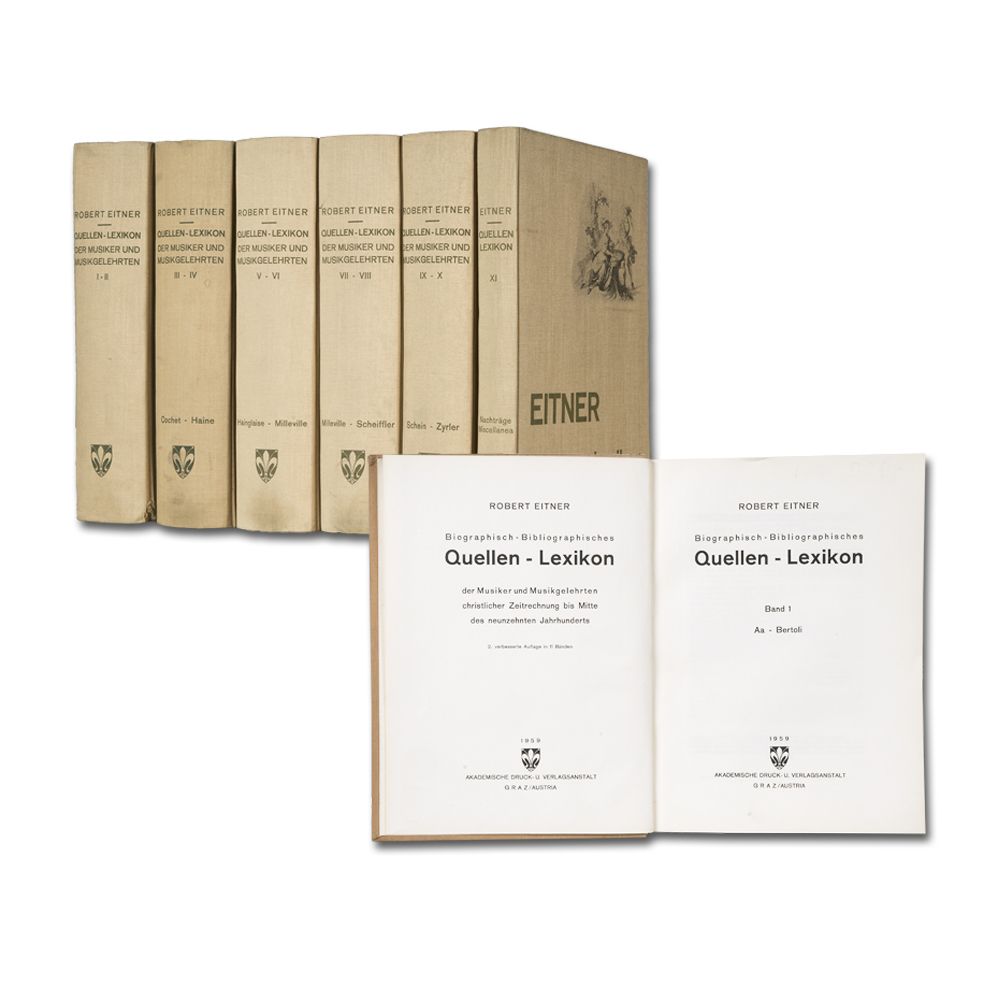 EITNER, R.: Biographisch-Bibliographisches Quellen-Lexikon der Musiker und Musikgelehrten christlicher Zeitrechnung bis Mitte des neunzehnten Jahrhunderts. 2. verb. Aufl. 11 in 6 Bdn. Graz Akademische Druck- u. Verlagsanstalt 1959-60 OLn.