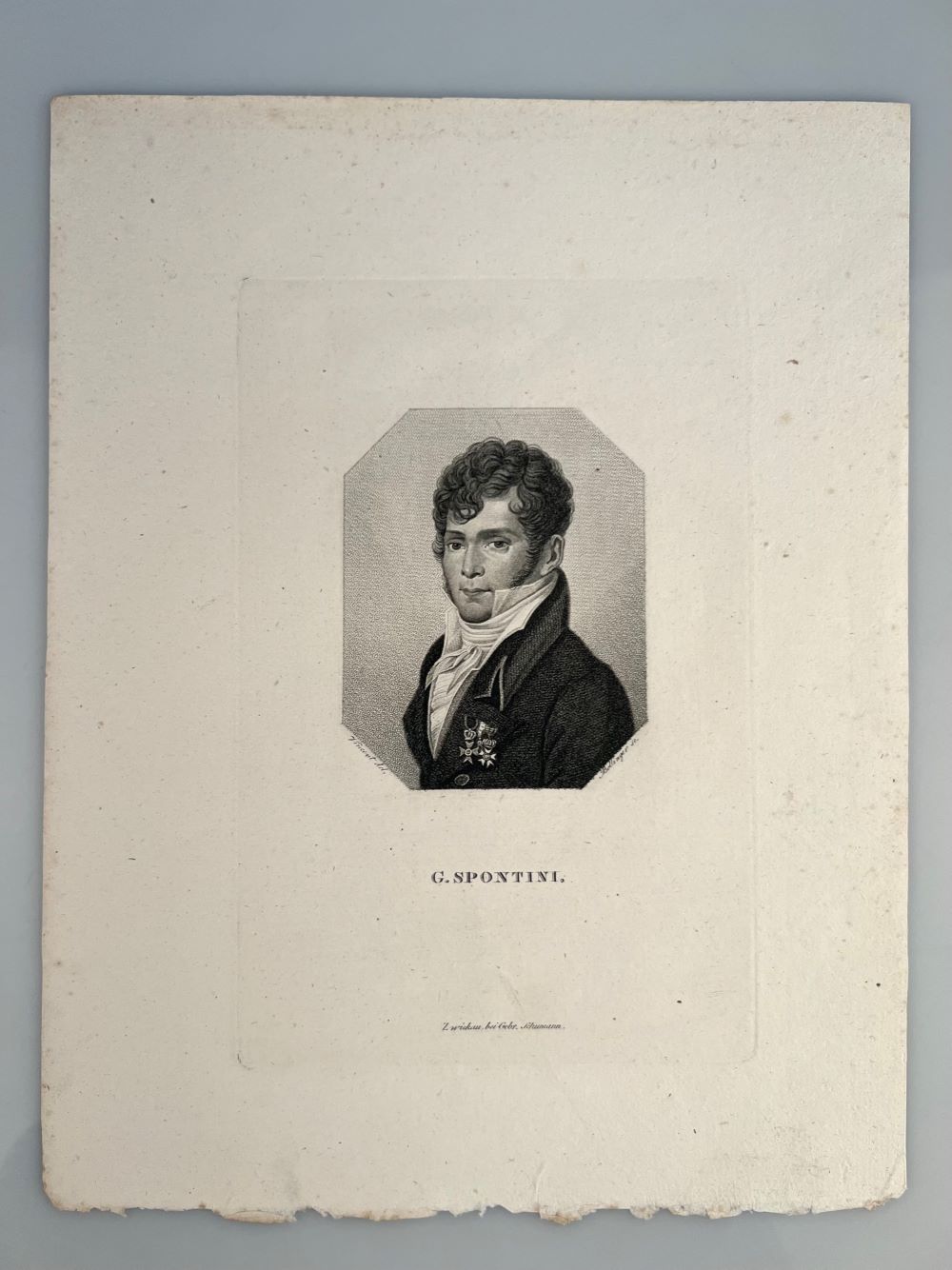 SPONTINI, Gaspare. - Portrait. Porträt. Brustbild nach links. (Oktogon). Kupferstich in Punktiermanier von Bollinger nach [A. P.] Vincent. Zwickau Gebr. Schumann [ca. 1825] 19 x 12,2 cm. Schöner kräftiger Abzug.