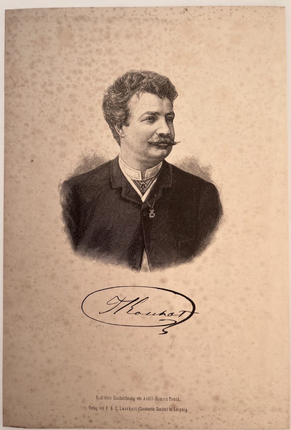 KOSCHAT, Thomas. - Portrait, Porträt, Halbfigur, Brustbild. Holzstich nach einer Handzeichnung von Adèll-Henric Truck. Leipzig, F. E. C. Leuckart [1884] 26, 5 x 18 cm. Stockfleckig.