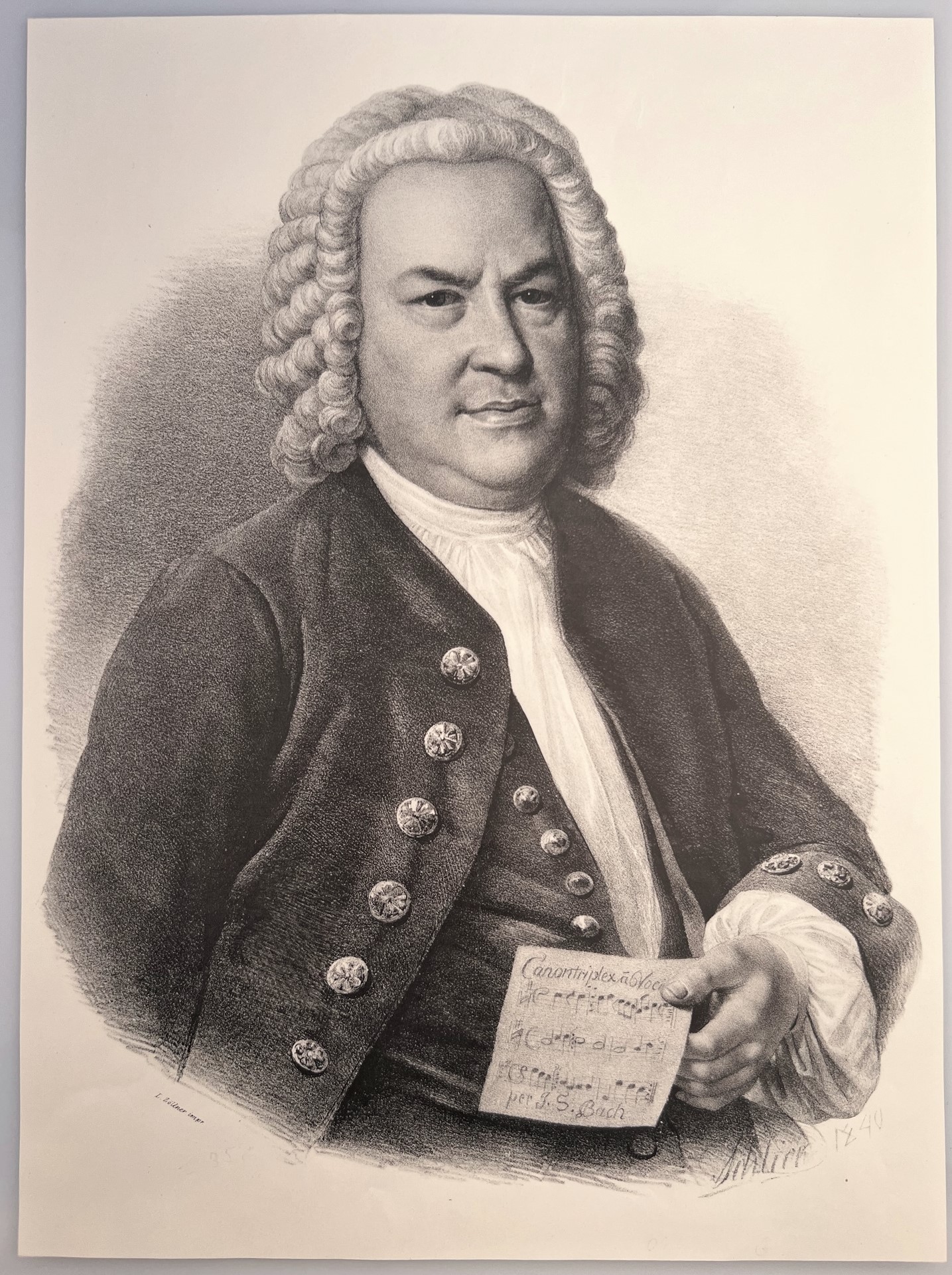 Die Lithographie entstand nach dem berühmten Gemälde von Elias Gottlob Haußmann von 1746, in dem Bach in der linken Hand ein Blatt mit 3 Takten einer Fuge im 6/4 Takt mit Unterschrift hält. - Vgl. Neumann S. 22, B 15.