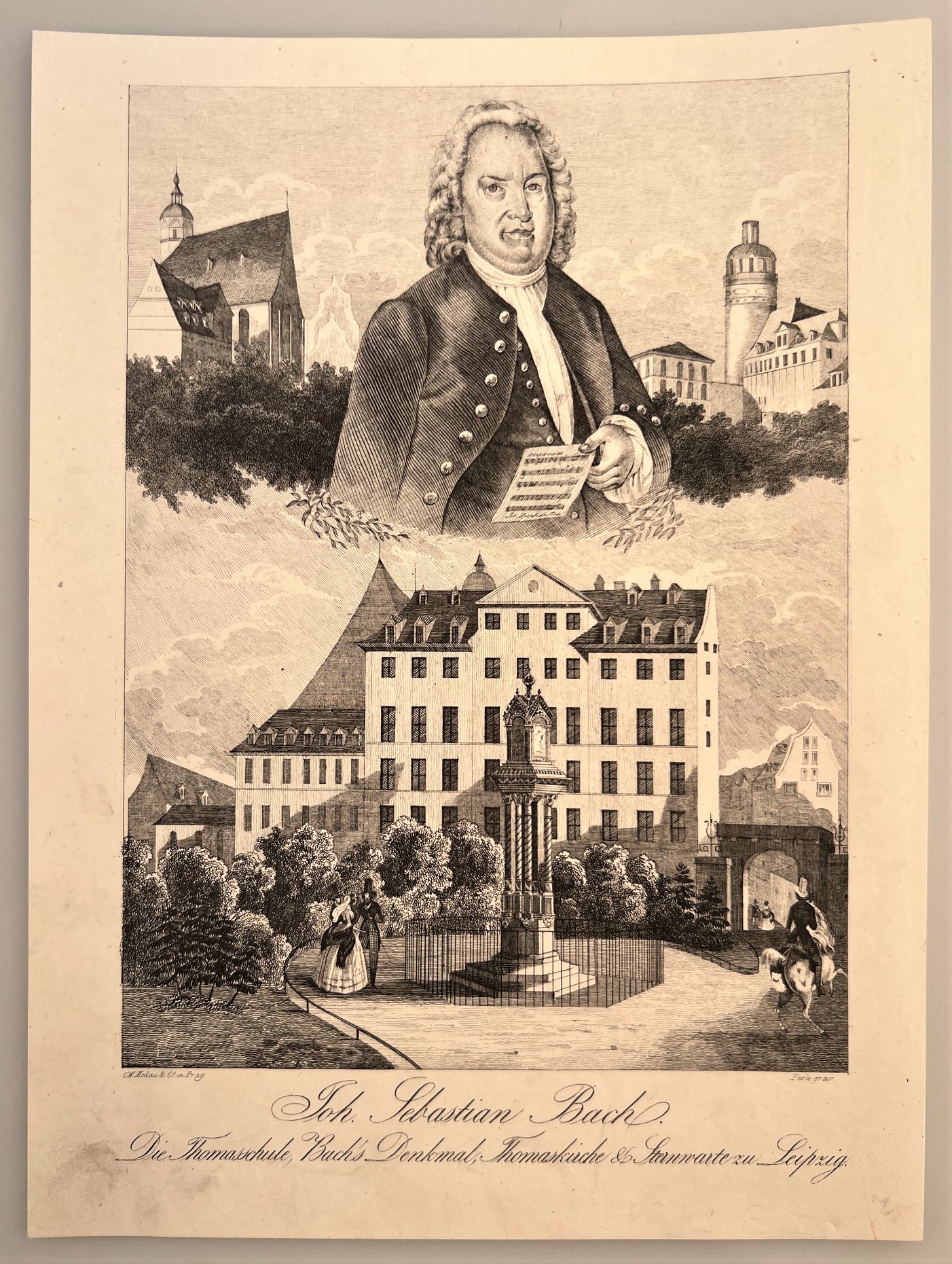BACH, Johann Sebastian. - Portrait, Porträt, Brustbild von Joh. Sebastian Bach. Die Thomasschule, Bach's Denkmal, Thomas Kirche & Sternwarte zu Leipzig. Stahlstich von Farle. Prag, C. W. Medau und Co. 19,5 x 14 cm.