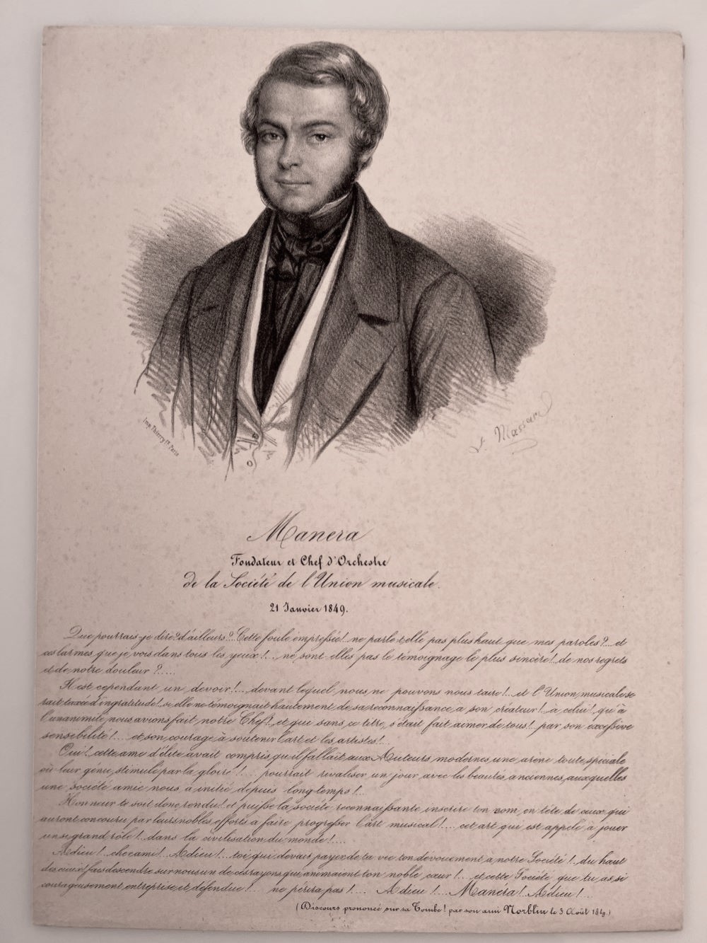 MANERA, Jean - Portrait. Porträt, Halbfigur, Brustbild. Lithographie von Thierry frères nach einer Zeichnung von Leopold Massard mit einem Nachruf von [Louis-Pierre] Norblin. Paris Thierry fr. 1849 25,5 x 18 cm.