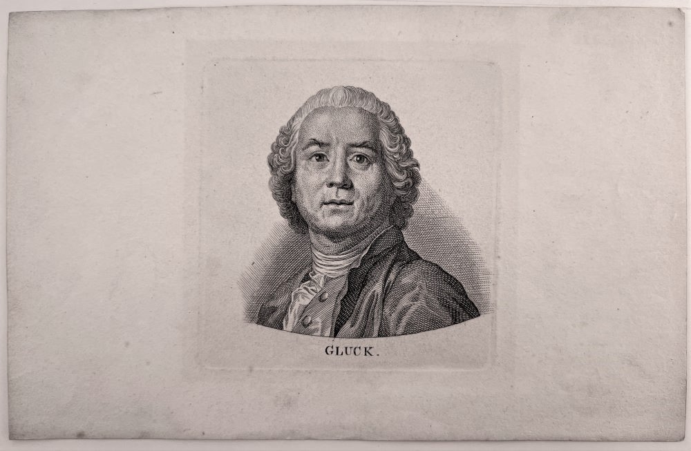 GLUCK [Christoph Willibald]. - Portrait, Porträt, Halbfigur, Brustbild nach links. Stahlstich nach dem Gemälde von J. Duplessis. Um 1840. 8,2 x 7,8 cm. Farbiges Passepartout.