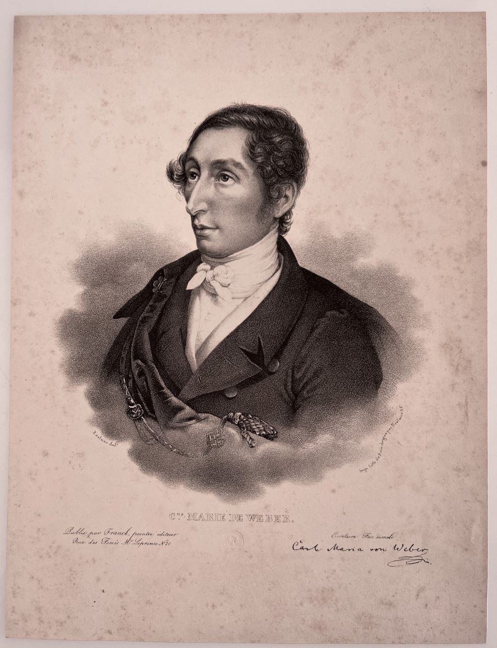 WEBER, Carl Maria von. - Portrait, Porträt, Brustbild, Halbfigur. Lithographie von Zoelner nach dem Gemälde von C. Vogel. [Paris?] Franck [ca. 1830]. 31 x 23,5 cm. Leicht stockfleckig.