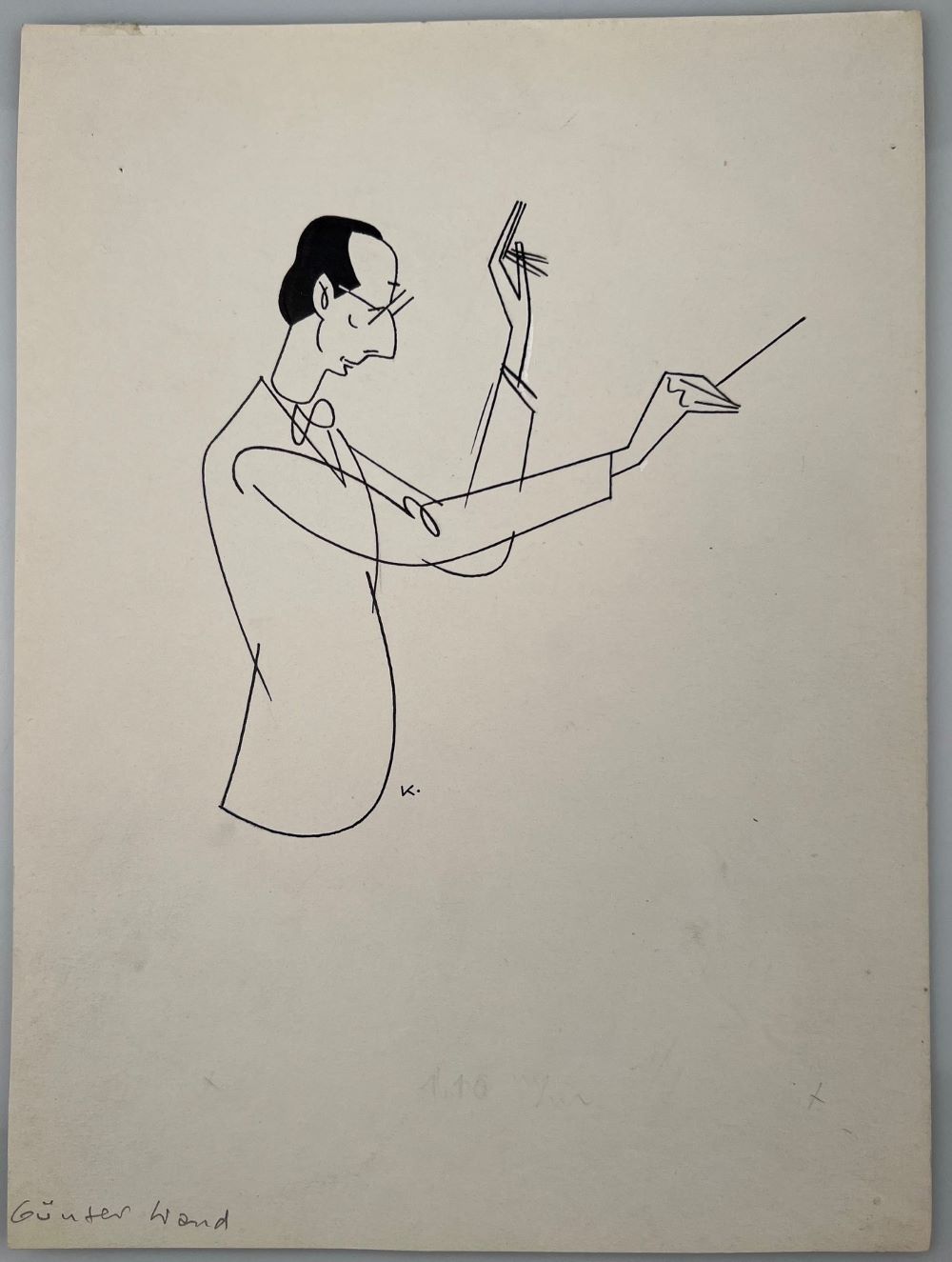 KEY, Willy: Halbfigur. Günter Wand beim Dirigieren. Karikatur. Tuschezeichnung auf Karton. 28 x 20,5 cm
