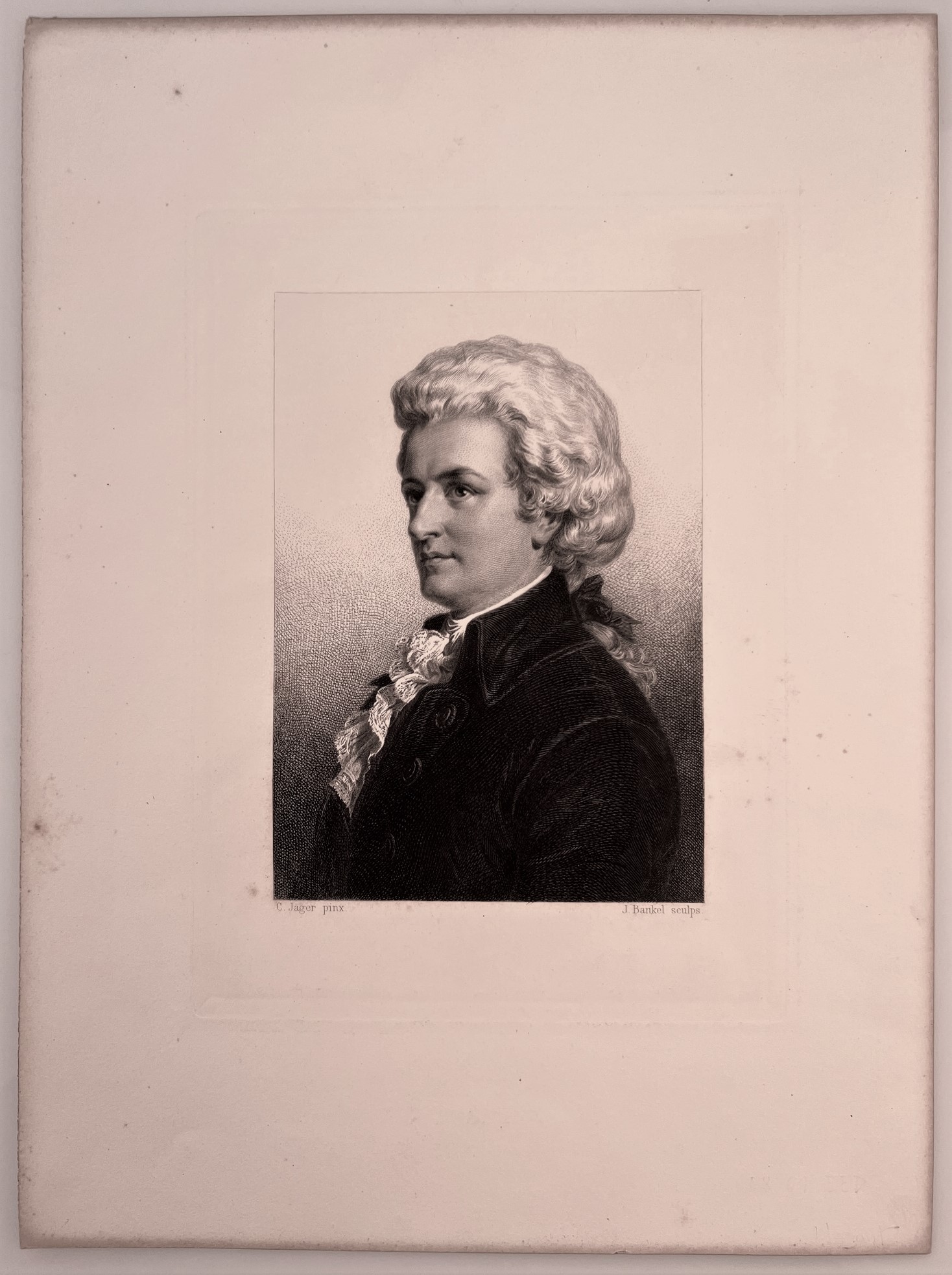 MOZART, Wolfgang Amadeus. - Portrait, Porträt, Brustbild, Halbfigur nach dreiviertellinks, Stahlstich von Johann Bankel nach Carl Jäger. [Um 1870] 18,3 x 12,8 cm. Wenige Fleckchen, sonst sehr breitrandig.