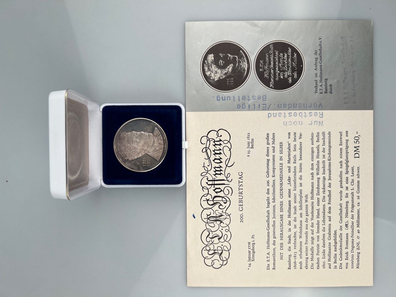 HOFFMANN, E. T. A. - Gedenkmedaille in Feinsilber zum 200. Geburtstag. Hergestellt nach einem Entwurf von Erich Rosmann im Auftrag der Hoffmann-Gesellschaft. Rückseite: "E. T. A. Hoffmann Kammer-Gerichts-Rath ausgezeichnet im Amte als Dichter als Tonkünstler als Maler". Nürnberg, Prägeanstalt L. Ch. Lauer 1976 Rund. Durchmesser 40 Millimeter, Gewicht ca. 26 gr. In Schatulle.
