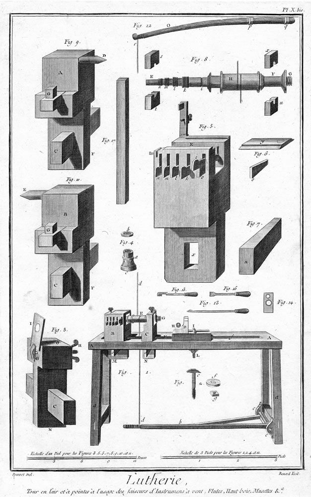 Der "Lutherie" war ein Sonderband in der berühmten mehrbändigen Enzyklopädie gewidmet und beschäftigt sich ausschließlich mit dem Instrumentenbau. Das Blatt zeigt die Werkbank und Werkzeuge für den Bau von verschiedenen Holzblas-Instrumenten. - Siehe Abbildung.