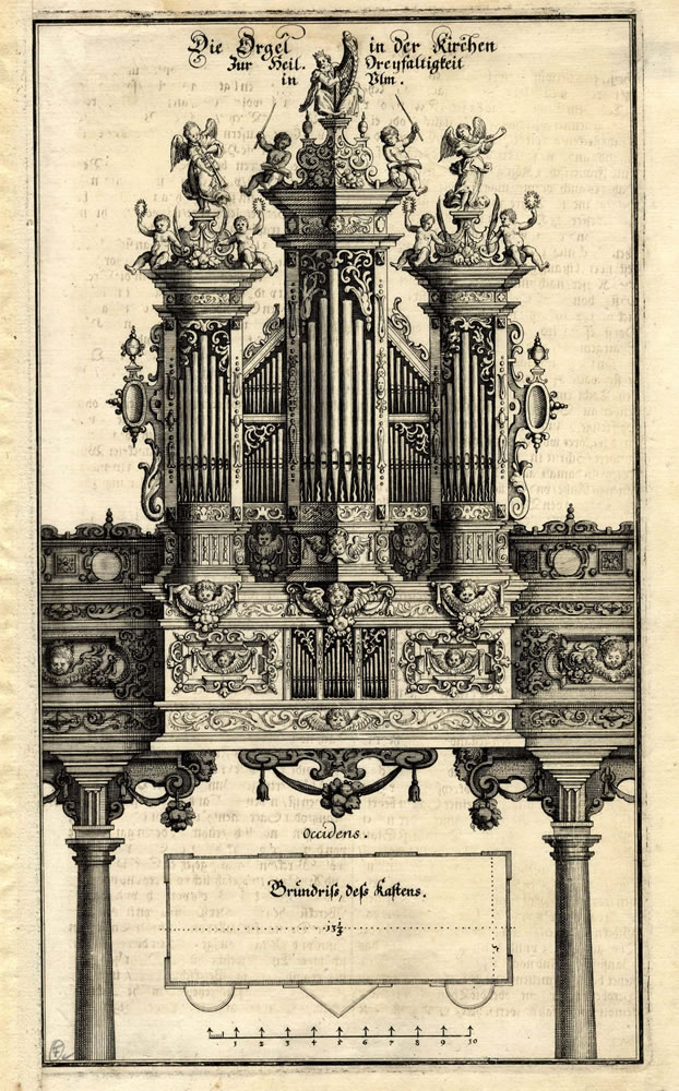 Eine der seltenen Orgel-Darstellungen Merians aus seiner "Topographia Sveviae". Die von Johannes Ehemann erbaute Orgel mit Hauptwerk, Unterwerk und Pedal ist in eine Brüstung gestellt, so dass der Spieltisch hinter das Instrument zu bauen war. Die Schauseite des Prospekts weist einen besonders reichen figurativen Schmuck auf; darunter ist der Gehäuse-Grundriss samt Maßeinheit abgebildet. - Vgl. Disposition bei Supper/Meyer, Barockorgeln in Oberschwaben, Kassel [1941], S. 161.