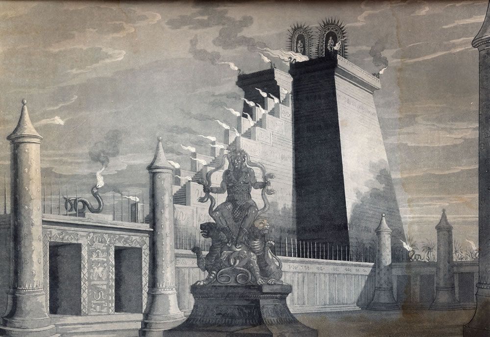 Beeindruckendes großformatiges Dekorations-Blatt mit Schriftrand (Gedr. v. Hampe) zur Oper 'Fernand Cortez ou la conquête du Mexique', Libretto von Victor-Joseph Etienne de Jouy (1764-1846) und Joseph-Alphonse d'Esménard (1770-1811), Musik von Gaspare Spontini (1774-1851). "Die Proportionen von Originalentwurf und Aquatinta stimmen nahezu überein. Hier ist jedoch etwas mehr Boden und Himmel wiedergegeben. Die Architektur wirkt gedrungener." (Werkkatalog 47 A). "... die hohen pylonenartigen Gebäude mit einer Treppe und das Götzenbild im Vordergrunde, welche in nächtlicher Beleuchtung eine so große Wirkung machen, (sind) mexikanischen Denkmalen frei nachgebildet." (G. F. Waagen in: Berliner Kalender, 1844, S. 342). "Schinkel hat zu zwei verschiedenen Inszenierungen der Oper, 1818 und 1824, insgesamt fünf Dekorationsentwürfe geschaffen; drei sind heute noch vorhanden, zwei literarisch überliefert. Zur Aufführung von 1818 hat er drei Entwürfe geliefert (Kat. 47-49), zwei sind später entstanden (Kat. 50, 51)." (Harten S. 264). - Der Entwurf blieb als "Gouach über Bleistift. 42, 3 x 58 cm" in den Staatl. Museen zu Berlin erhalten (Farbtafel Kat. 47). Keiner der von Theatermalern ausgeführten Hintergrundprospekte blieb erhalten. Von den zahlreichen Bühnenentwürfen Schinkels sind nur 104 Entwürfe im Original vorhanden oder durch Kopien und Reproduktionen überliefert. - Thieme-Becker XXX, S. 78. - Im 'Ersten Brief' der geplanten Reihe 'Briefe über Tonkunst in Berlin' den Hoffmann am 10. Dez. 1814 an die Redaktion der AMZ geschickt hatte, berichtete er u. a. auch über eine Aufführung (13. Nov. 1814) des 'Ferdinand Cortez' von Spontini. In dem Aufsatz der am 11. Januar 1815 erschien, kam Spontini nicht gut weg: "H. (hatte) bei der Besprechung einer Aufführung des 'Cortez' noch scharfe Ausdrücke gegen Spontini gebraucht. Wohl spricht er ihm Genie und Talent zu, er hält ihn 'für viel besser, als er sich bis jetzt gezeigt hat' und glaubt, daß er seine 'eigentliche Heimath nur hartnäckig verleugnet', verurteilt aber mit außergewöhnlicher Schärfe Melodie, Harmonie, Rhythmus und Instrumentation und kommt zu dem vernichtenden Ergebnis, 'daß es der Spontinischen Musik gänzlich an innerer Wahrheit mangle'" (E. T. A. Hoffmanns Briefwechsel. Hrsg. v. F. Schnapp, Bd. II, S. 260, Anmerkung 5). Ob Hoffmann die spätere Inszenierung mit den Schinkel-Dekorationen 1818 in Berlin gesehen hat, ist nicht überliefert. - Siehe Abbildung.