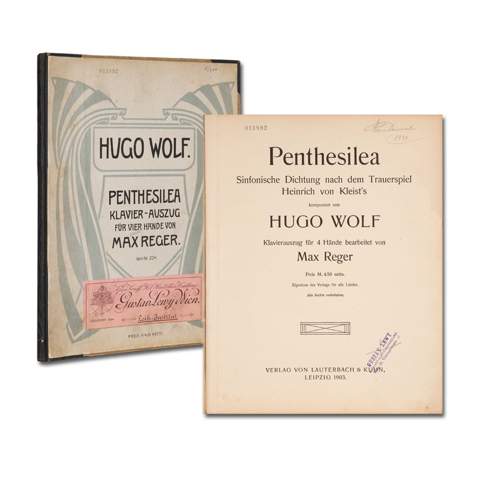 REGER, M.: Penthesilea. Sinfonische Dichtung nach dem Trauerspiel H. von Kleist's. Klavierauszug für 4 Hände bearbeitet von M. Reger. Leipzig Lauterbach & Kuhn (VerlagsNr. L. & K. 115) 1903 Quart. 51 S. Titel gestempelt. Halbleinenband mit aufgezogenem OU.