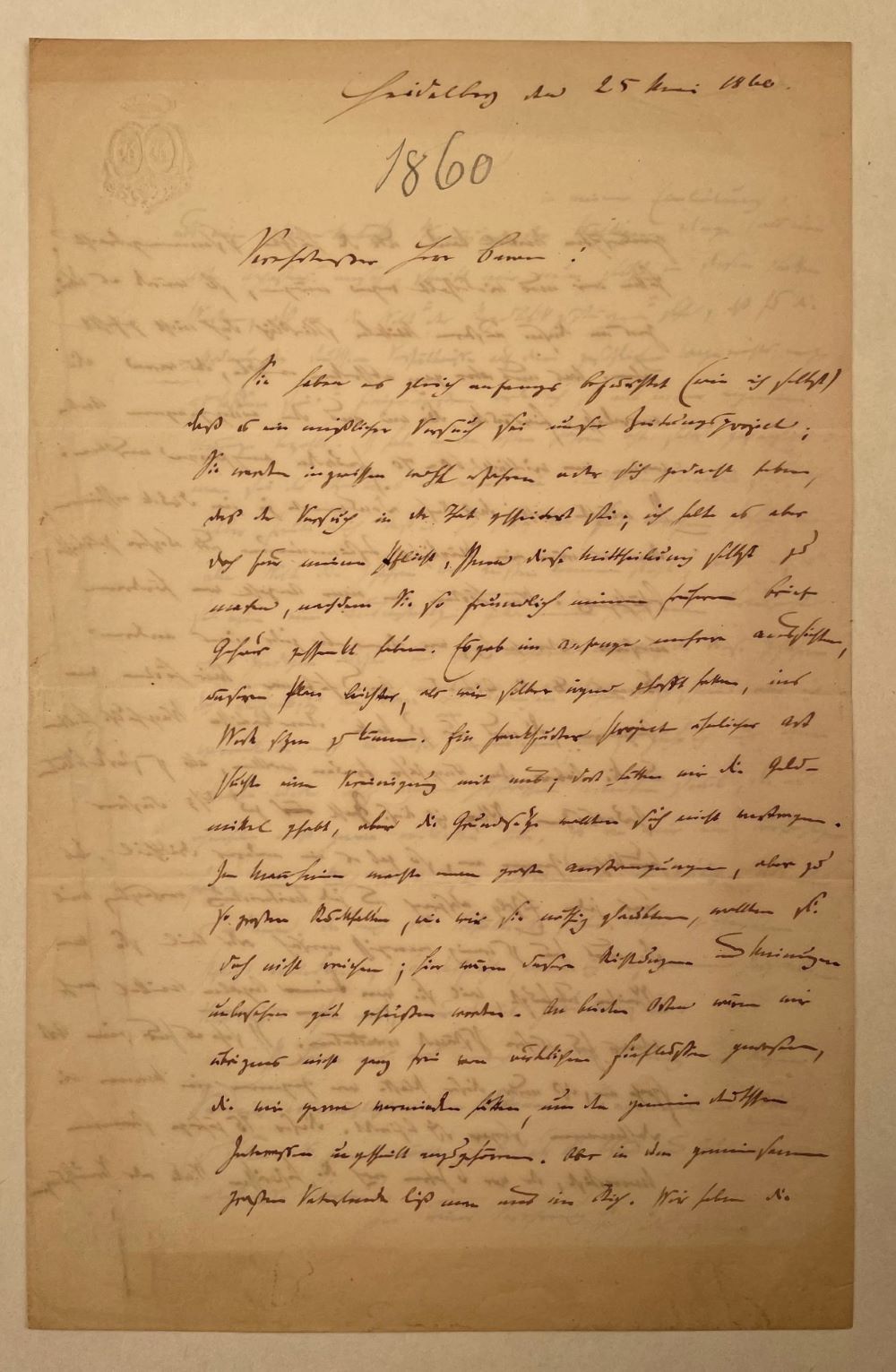 GERVINUS, Georg Gottfried [1805-1871]: Eigenhändiger Brief mit Datum und Unterschrift. Blindsiegel. Heidelberg 25. Mai 1860 Großoktav. 21,3 x 13,6 cm. 3 Seiten auf Doppelbogen. Etwas gebräunt.