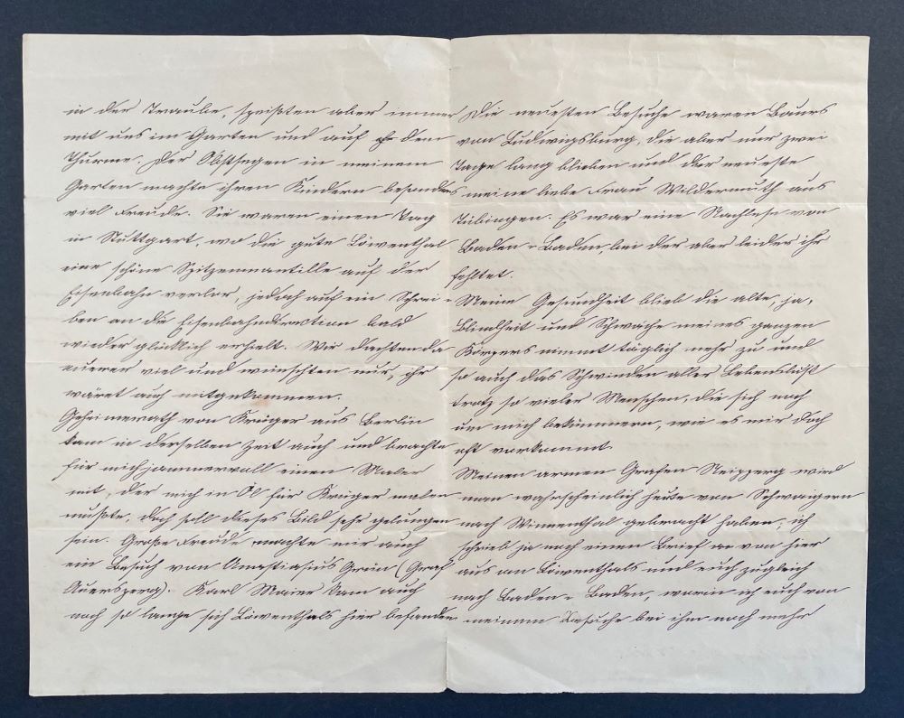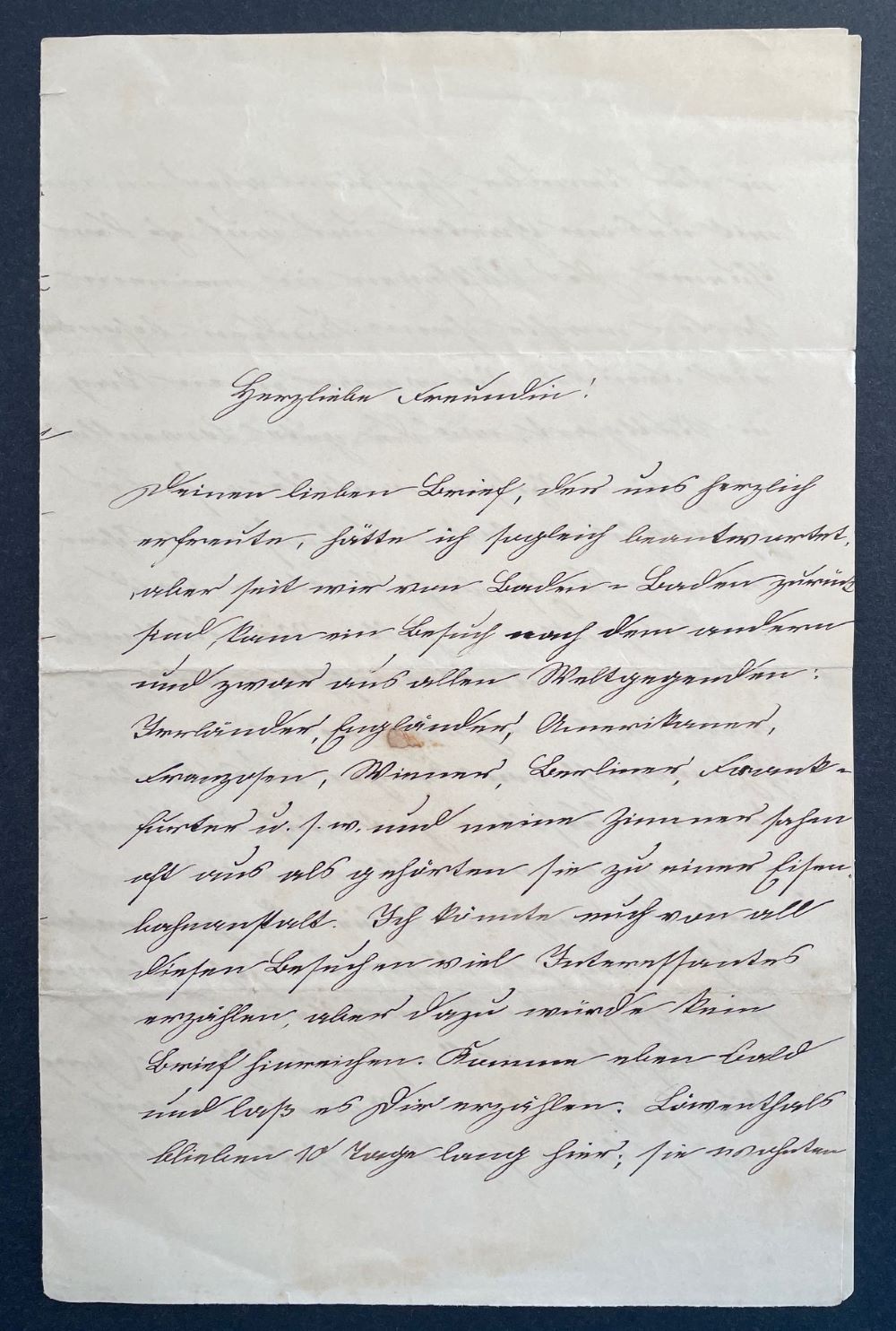 Inhaltsreiches ausführliches Schreiben an Emilie, die Frau des Obertribunalpräsidenten Gustav von Pfaff in Esslingen, mit denen Kerner eng freundschaftlich verbunden war. Er berichtet von zahlreichen Besuchen "aus allen Weltgegenden" seit der Rückkehr von Baden-Baden. "Meine Zimmer sahen oft aus als gehörten sie zu einer Eisenbahnanstalt". Zu diesen Besuchernzählte auch die Familie Löwenthal, die 10 Tage blieben, zwar in der Traube wohnten, jedoch mit Kerner und seiner Tochter "im Garten und auf dem Thurme speiszten". Der Wiener Dichter Max von Löwenthal und seine Frau Sophie besuchten das Kernerhaus öfter. Während eines Stuttgartbesuches in dieser Zeit verlor "die gute Löwenthal eine schöne Spitzenmantille auf der Eisenbahn", die sie " jedoch auf ein Schreiben an die Eisenbahndirection bald wieder glücklich erhielt. Geheimrat von Krieger aus Berlin kam in derselben Zeit auch und brachte für mich jammervoll einen Maler mit [Julius Hamel, 1834-1907], der mich in Öl für Krieger malen muszte, doch soll dieses Bild sehr gelungen sein". Es ist wohl das letzte Porträt, das von dem Dichter gemacht wurde und das gegen seinen Willen Krieger statt seiner erhielt. Der einschlägigen Forschung blieb es bis 1975 unbekannt. In der gleichen Zeit besuchten ihn auch Anastasius Grün und Karl Mayer (1786-1870), der alte Freund aus Tübinger Zeiten, der u.a. als wichtiger Chronist der "Schwäbischen Romantik" bekannt wurde. "Die neuesten Besuche waren Baurs von Ludwigsburg [wohl Obertribunalrat Johann Gottlieb B., 1776-1855] ... und der neueste meine liebe Frau Wildermuth aus Tübingen" [Ottilie W., die am 7. 10. von Weinsberg nach Vaihingen abgereist war]. Kerner beklagt seine täglich mehr zunehmende "Blindheit und Schwäche und das Schwinden aller Lebenslust" trotz der Bemühungen so vieler Menschen um ihn. Den "armen Grafen Neipperg" habe man nach "Winnenthal" [Zellersche Klinik] gebracht, das heutige Psychiatrische Landeskrankenhaus Winnenden. Alfred August Graf von Neipperg, verheiratet mit Marie von Württemberg, Tochter König Wilhelm I - die von Kerner besonders verehrt wurde -, war mit zunehmendem Alter irrsinnig geworden. Kerner wünscht den Freunden für ihren Baden-Baden-Aufenthalt mehr Erfolg als er ihn hatte und gibt der Angst um die Gesundheit seiner Tochter Marie Ausdruck. Er bittet abschließend "habt mit eurer alten treuen Liebe uns ferner lieb, werde ich auch noch so elend und simpelhaft". Die Schreiberin des Briefes könnte Anna Niethhammer (1846-1898), die Enkelin Justinus Kerners sein, die er selbst als seinen "Sekretär" bezeichnet hat. - Eine vollständige Transkription des Textes liegt dem Brief bei. - Vgl. Mörike-Kat. Marbach, 1975, Nr. 226 mit Abbildung.