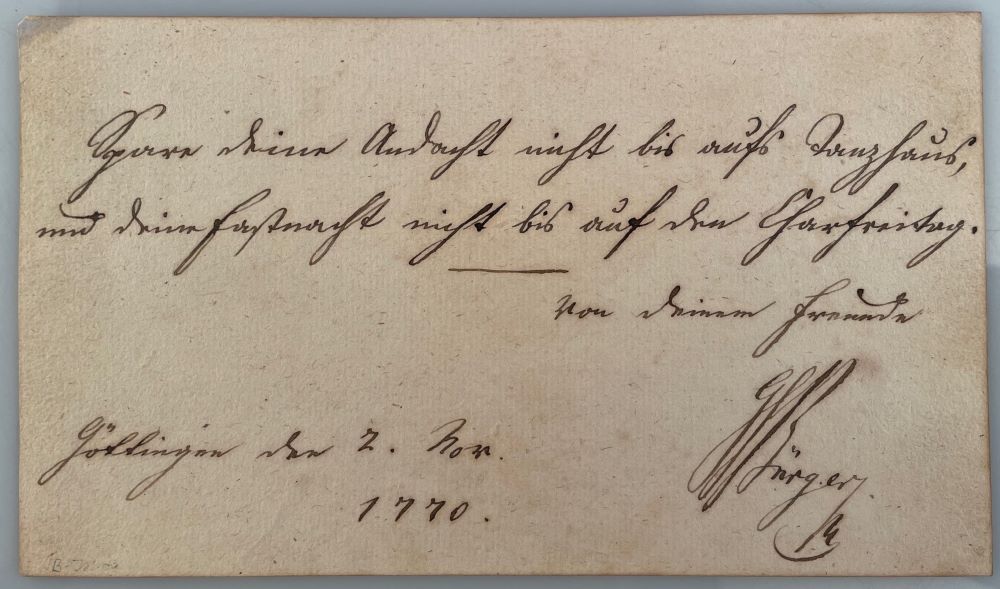 BÜRGER, Gottfried August [1747-1794]: Eigenhändiges Stammbuchblatt mit Datum und Unterschrift. Göttingen 2. Nov[ember] 1770. Klein-Queroktav. 15,2 x 8,7 cm. 1 Seite. Leicht gebräunt. Dreiseitiger Goldschnitt.