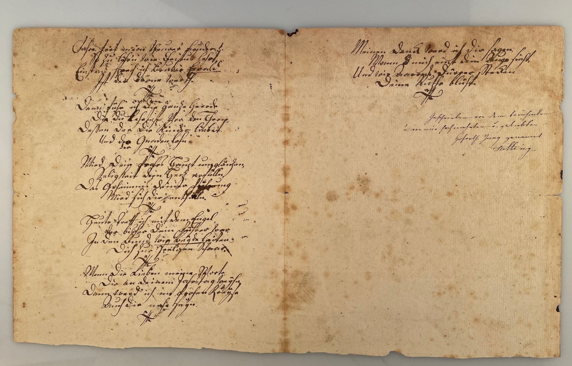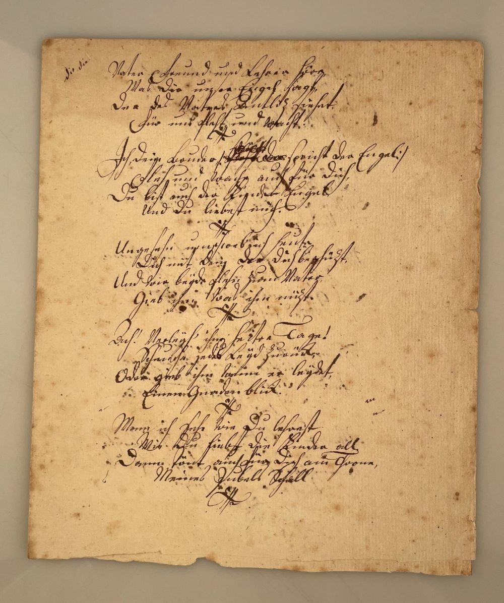 Ungesehen umschweb' ich heute / Dich mit Dem der Dich beschüzt, / Und wir beyde flehn zum Vater, / Gieb ihm was ihm nüzt. // ..."