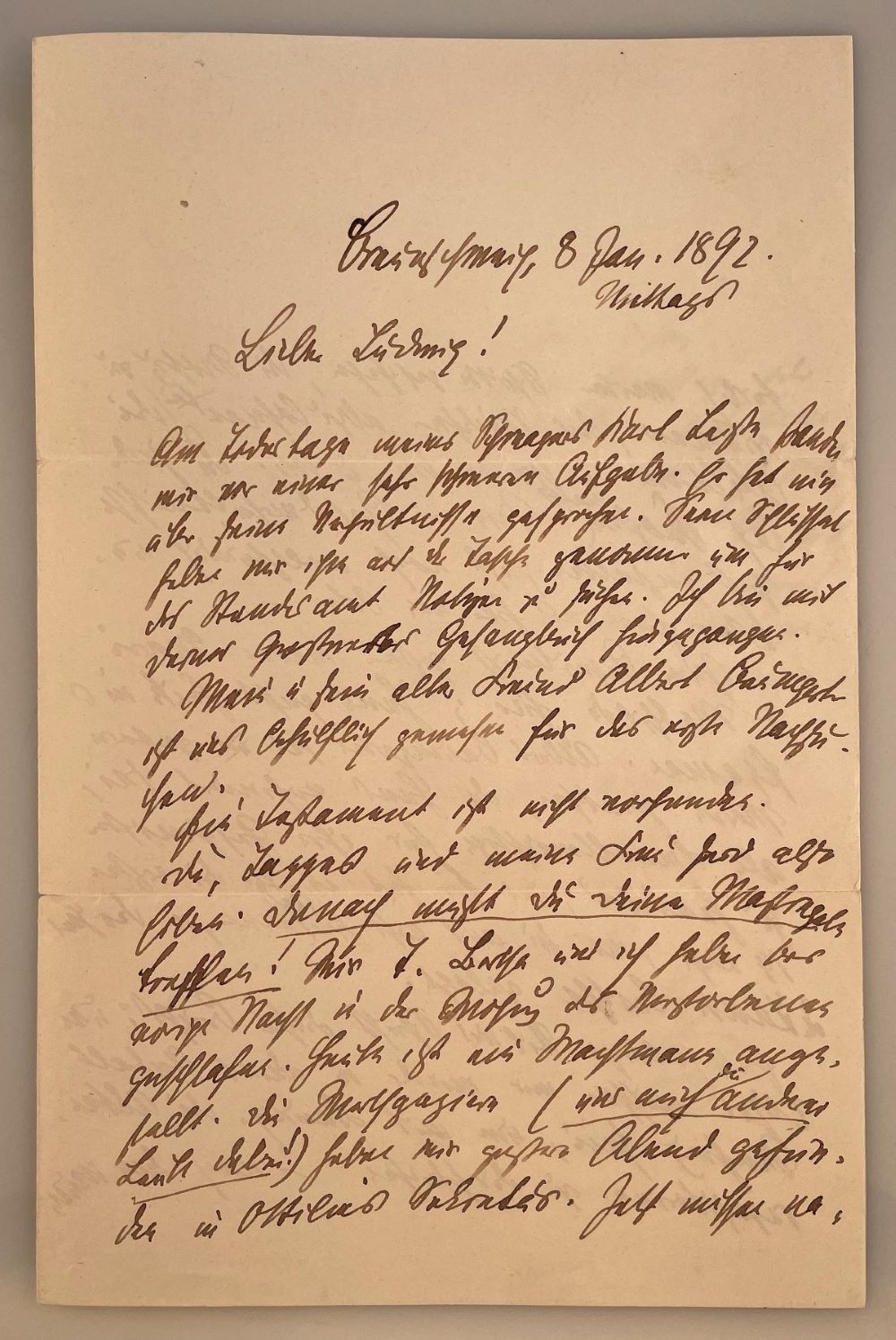RAABE, Wilhelm [1831-1910]: Eigenhändiger Brief mit Datum und Unterschrift. Braunschweig 8. Jan.[uar] 1892. Mittags. 3 Seiten. 22x14 cm. Knickfalten. Kleine Falzeinrisse.