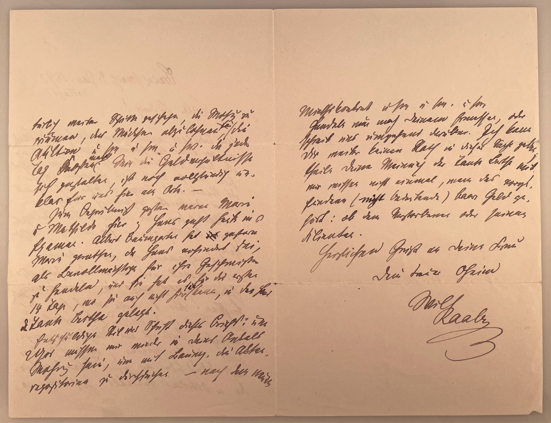 Wilhelm Raabe hatte einen ausgeprägten Familiensinn, der sich auch in diesem sehr persönlichen, unveröffentlichten Brief an seinem Neffen Ludwig August Christian Floto [1855-1928] zeigt. Über schmerzliche Familienereignisse berichtet Raabe: "Am Todestag meines Schwagers Karl Leiste standen wir vor einer sehr schweren Aufgabe. Er hat nie über seine Verhältnisse gesprochen. Seine Schlüssel haben wir ihm aus der Tasche genommen um für das Standesamt Notizen zu suchen. Ich bin mit Deines Großvaters Gesangbuch hingegangen. Mein und Dein alter Freund Albert Baumgarten [Jurist 1828-1893] ist behülflich gewesen für das erste Nachsuchen. Ein Testament ist nicht vorhanden. Du, Toppes und meine Frau [Bertha, geb. Leiste (1835-1914)] sind also Erben. Danach musst du Deine Massregeln treffen! Wir T[ante] Bertha und ich haben vor vorige Nacht in der Wohnung des Verstorbenen geschlafen. Heute ist ein Wachmann angestellt. Die Werthpapiere ... haben wir gestern Abend gefunden in Ottiliens [= Leistes verstorbene Frau] Sekretär. Jetzt müssen natürlich weitere Schritte geschehen, die Woh[nun]g zu räumen, das Mädchen abzuholen, für die Auktion usw da jeder Tag Kosten macht. Wie die Geldverhältnisse sich gestalten, ist noch vollständig unklar für uns hier am Orte. - ... Wir wissen nicht einmal, wem das vorgefundene (nicht unbedeutende) baar Geld gehört: ob dem Verstorbenen oder seinen Klienten". Karl Leiste [1826-1892] war Rechtsanwalt, Notar und Justizrat in Braunschweig, weswegen es umso mehr verwundert, dass er kein Testament hinterlassen hatte. Die Erben verfügten, dass seine Bibliothek mit 3.500 Bänden juristischer, geschichtlicher und belletristischer Literatur die Stadtbibliothek Braunschweig erhielt.