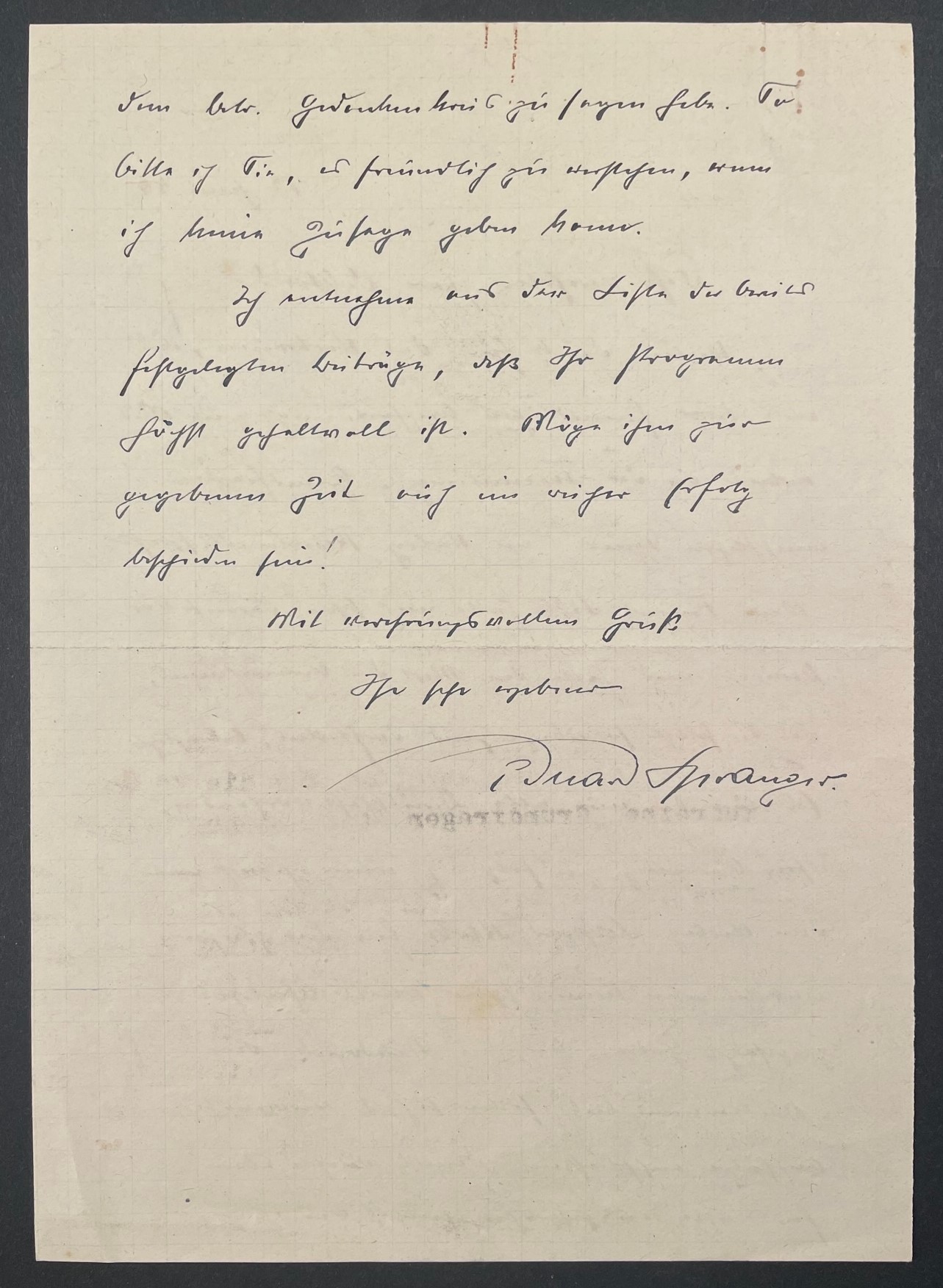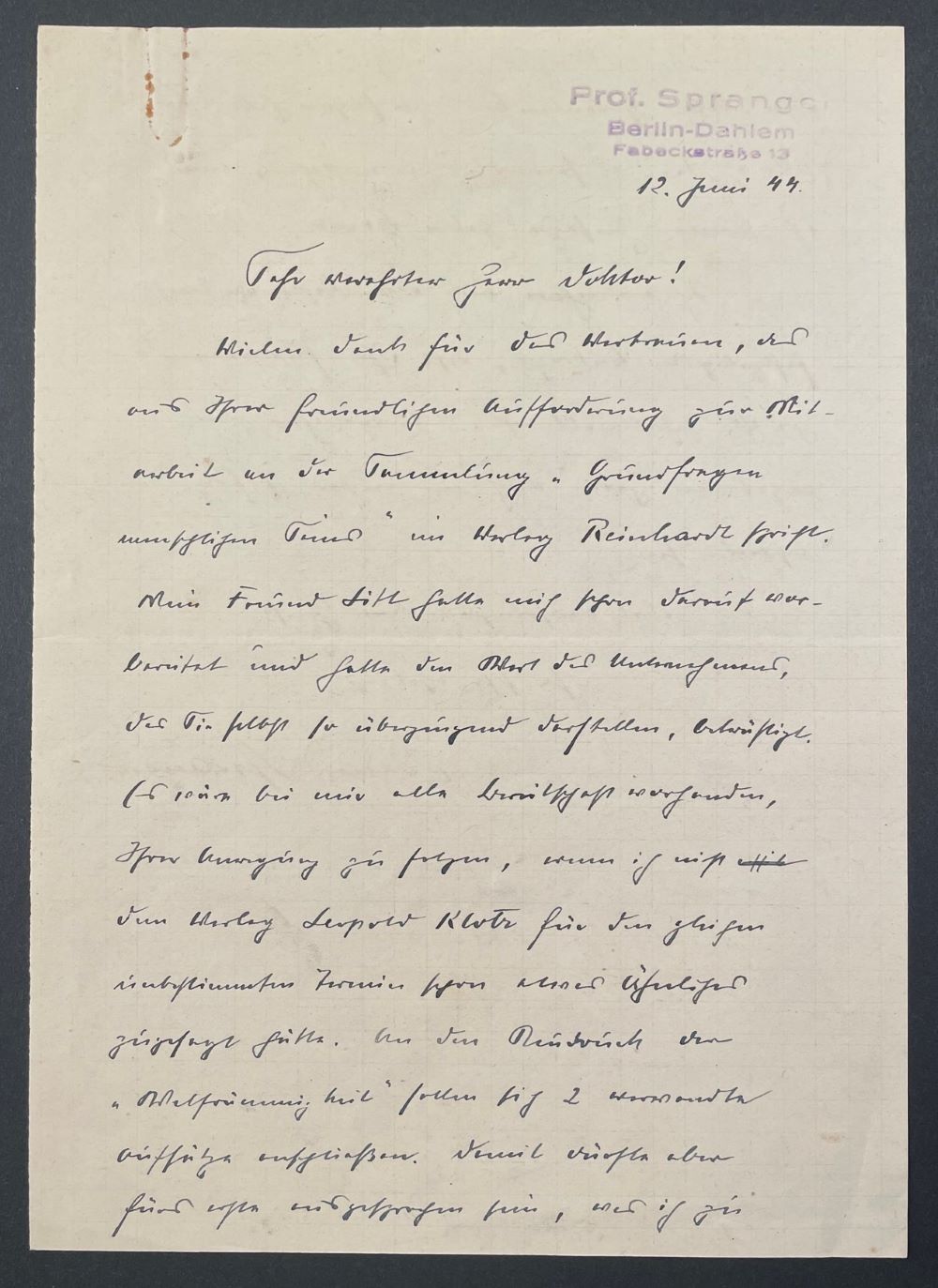 SPRANGER, Eduard [1882-1963]: Eigenhändiger Brief mit Datum und Unterschrift. Berlin (Stempel) 12. Juni [19]44. Oktav. 19 x 13, 5 cm. 1 1/2 Seiten. Klammerspuren am oberen Blattrand.