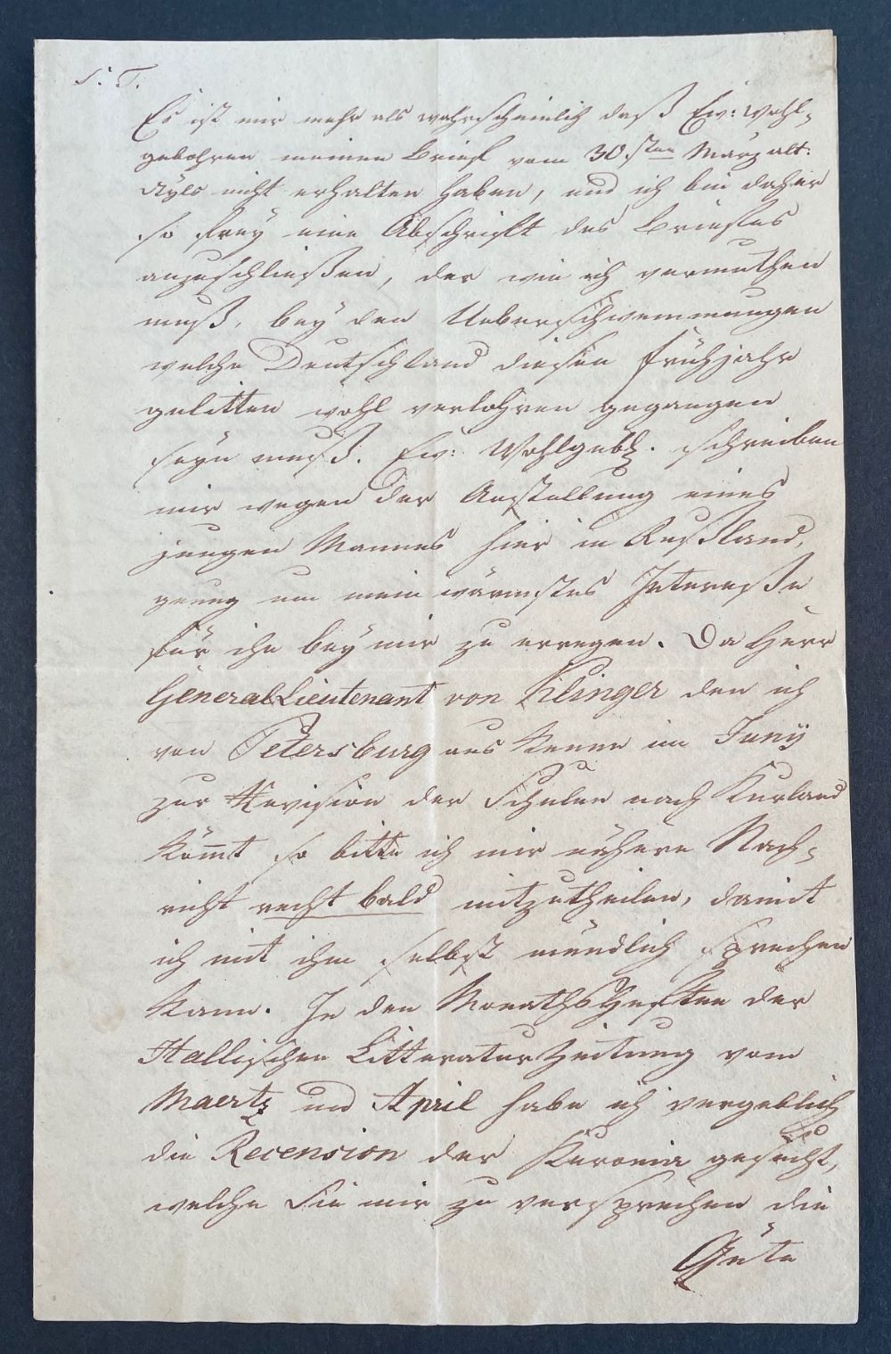 Umfangreicher Brief des kurländischen Politikers und Schriftstellers Ulrich Freiherr von Schlippenbach, der zu seiner Zeit einer der beliebtesten Dichter der baltischen Provinzen war. "Ew. Wohlgeboren schreiben mir wegen der Anstellung eines jungen Mannes hier in Rußland, genug um mein wärmstes Interesse für ihn bey mir zu erregen. Da Herrn General Lieutenant von [Friedrich Maximilian von] Klinger den ich von Petersburg aus kenne im Juny zur Revision der Schulen nach Kurland kommt so bitte ich mir nähere Nachricht recht bald mitzutheilen, damit ich mit ihm selbst mündlich sprechen kann. In den Monaths Heften der Hallischen Litteratur Zeitung vom Maertz und April habe ich vergeblich die Recension der Kuronia gesucht, welche Sie mir zu versprechen die Güte hatten. Meine innige Bitte sie bald erscheinen zu lassen ehe das von mir angekündigte Taschenbuch erscheint möge Erhörung finden. ... Im Juni habe ich durch den Herrn Buchhändler Hartmann der nach Leipzig geht, Gelegenheit Ew. Wohlgeb. Auslage, für beygeschloßene Ankündigung welche ich im Intelligenz Blatt einzurücken bitte, und für Porto wann Sie die Güte haben wollen mir das Blatt in welchem die Recension meiner Kuronia [eine Sammlung vaterländischer Gedichte], oder Ikonologie erscheint mit der Post zu senden...". - Schlippenbach stand mit vielen deutschen Schriftstellern in lebhaftem Briefwechsel.