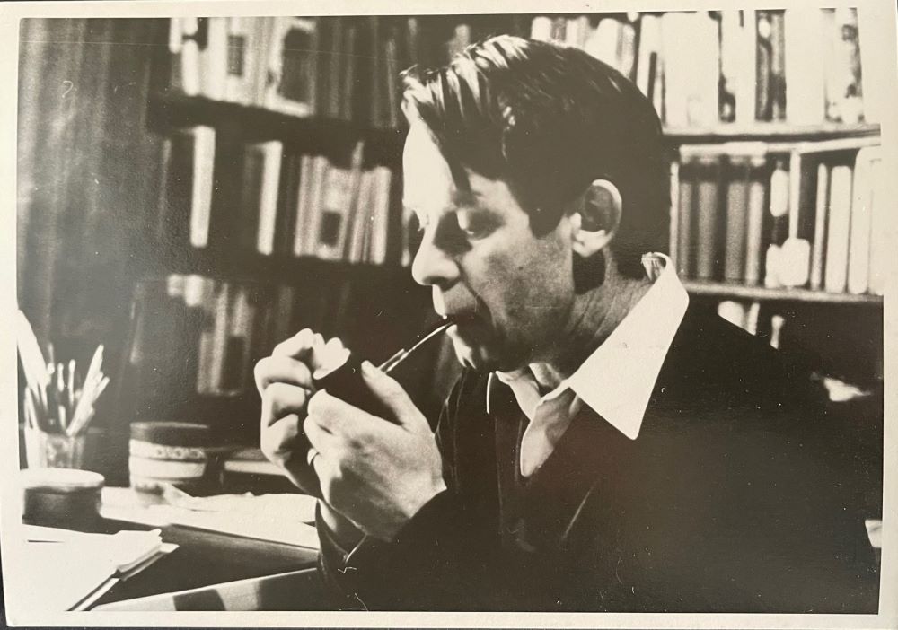 Schwarz-weiß-Porträt im Profil. Lenz Pfeife rauchend in seinem Arbeitszimmer.