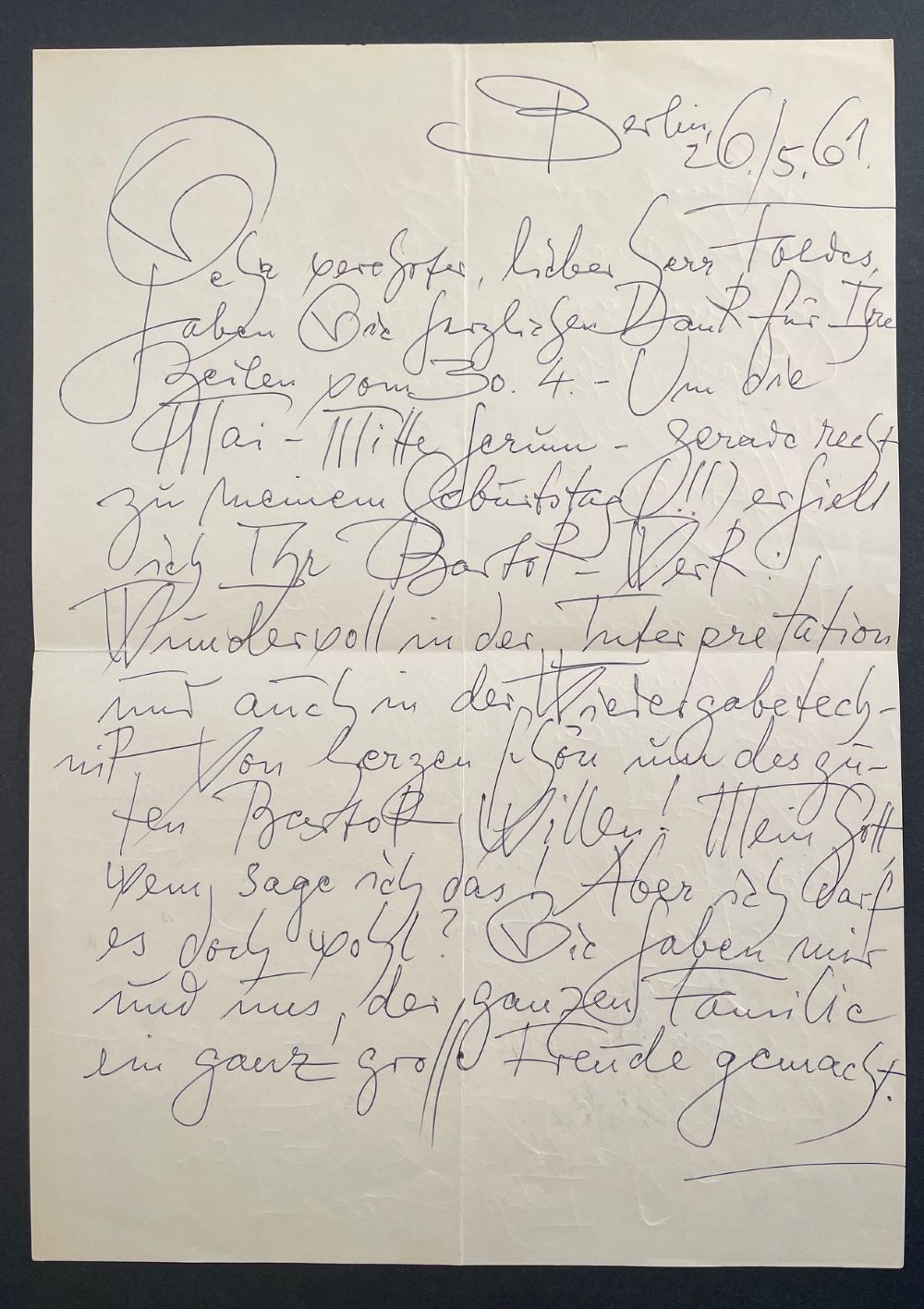 Mit schwungvoll-künstlerischer Hand geschriebener Dankesbrief an den Pianisten Andor Foldes (1913-1992), der ihm zum Geburtstag eine Langspielplatte mit Bartok-Interpretation von sich geschickt hatte. Foldes hatte im amerikanischen Exil 1940 in engster Übereinstimmung mit Béla Bartók dessen gesamtes Solo-Klavierwerk erarbeitet und auch später machte er sich einen Namen mit seinen großartigen Interpretationen der Bartókschen Klavierwerke.