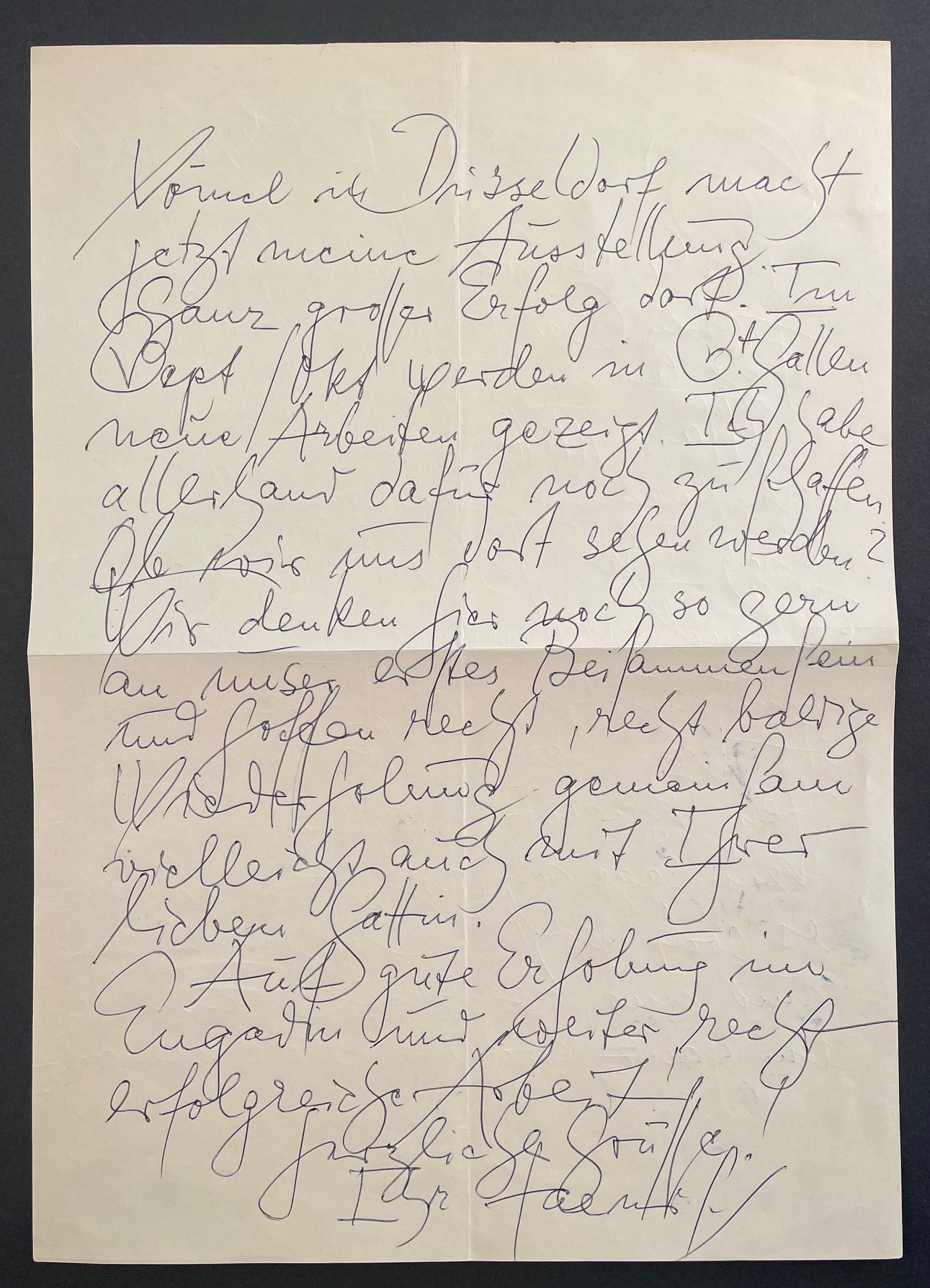 Vömel in Düsseldorf macht jetzt meine Ausstellung. Ganz grosser Erfolg dort. Im Sept./Okt. werden in St. Gallen [Ausstellung in der Galerie "Im Erker", 23. September bis 4. November 1961] neue Arbeiten gezeigt. Ich habe allerhand dafür noch zu schaffen Ob wir uns dort sehen werden? Wir denken hier noch so gern an unser erstes Beisammensein und hoffen recht, recht baldige Wiederholung gemeinsam vielleicht auch mit Ihrer lieben Gattin. Auf gute Erholung im Engadin und weiter recht erfolgreiche Arbeit.