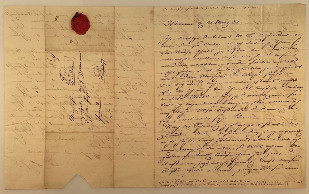 KAYSER, Philipp Christoph [1755-1823]: Eigenhändiger Brief mit Ort, Datum und Unterschrift. Weimar 31. März [17]81 Quart. 23,2 x 19 cm. 3 Seiten. Etwas gebräunt. Mit Siegel. Kleine biographische Notizen von fremder Hand auf der 1. Seite am oberen und unteren Rand.