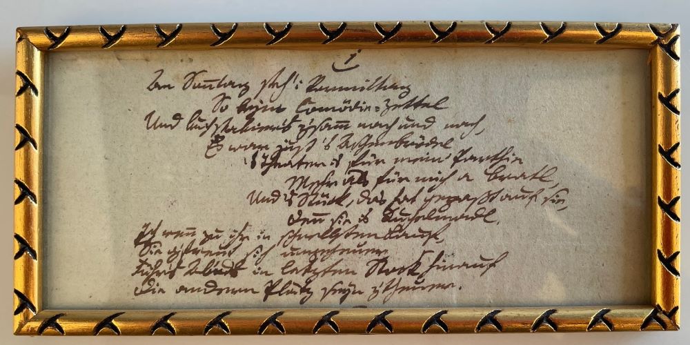 NESTROY, Johann [1801-1862]: Eigenhändiges Gedichtmanuskript. Ohne Ort und Datum [um 1834]. 6,5 x 15 cm. In Goldrahmen. Rückseitig von fremder Hand: "Originalhandschrift von Johann Nestroy ...".