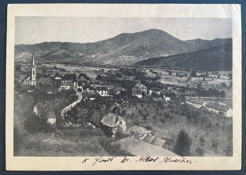 An Carlota de Landsberg, New York, Hotel Salisburg, gerichtet. Zunächst schreibt ihr ein Freund namens "Hugo", dass es sich in Günsbach, im Haus von Albert Schweitzer "ganz heimisch fühlt" und er dort "herzlich begrüßt und aufgenommen" wurde. Darunter die kurzen Grußworte von A. Schweitzer "mit besten Gedanken". - Albert Schweitzer war in Günsbach, im Elsass, aufgewachsen. Sein Vater war dort als Pfarrer tätig. Heute befindet sich im Ort ein Museum und der Sitz der internationalen Albert-Schweitzer-Stiftung (AISL).