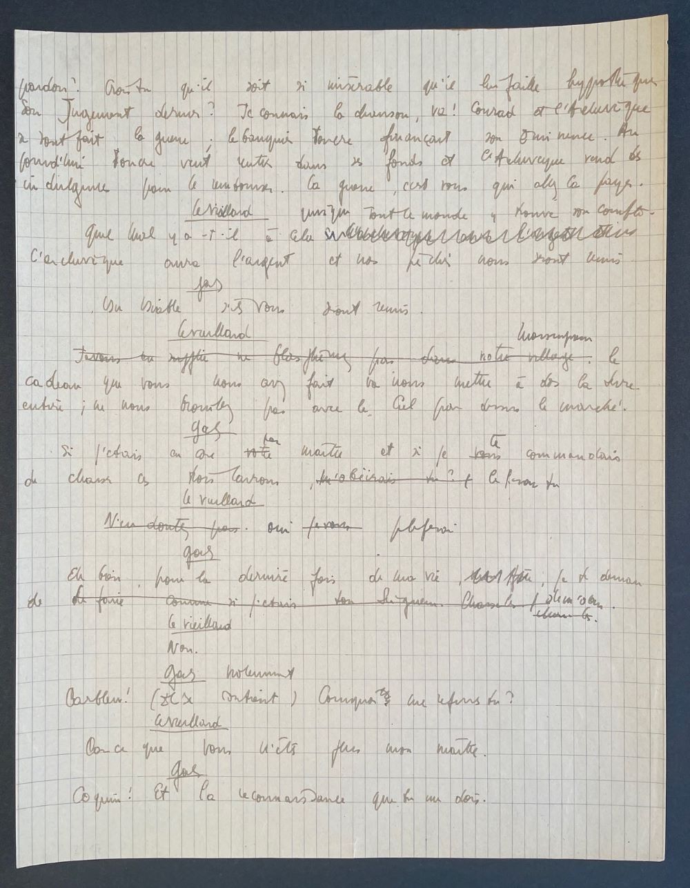 Ein Blatt aus dem Entwurf zu seinem Theaterstück "Le Diable et le Bon Dieu" ("Der Teufel und der liebe Gott"). Das Drama in drei Akten hatte Premiere am 7. Juni 1951 im Pariser Théâtre Antoine. Vorliegendes Arbeitsexemplar mit Streichungen und Korrekturen wurde so nicht übernommen in Akt II, Cinquième tableau, scène I, wo Götz auf den Viellard (Alten) trifft.