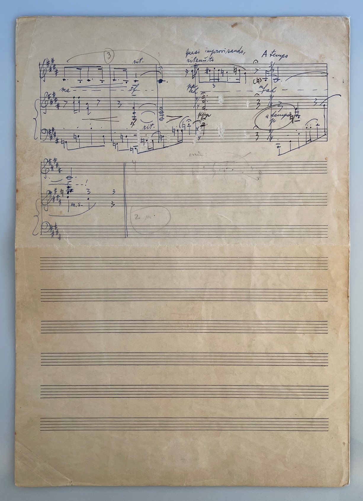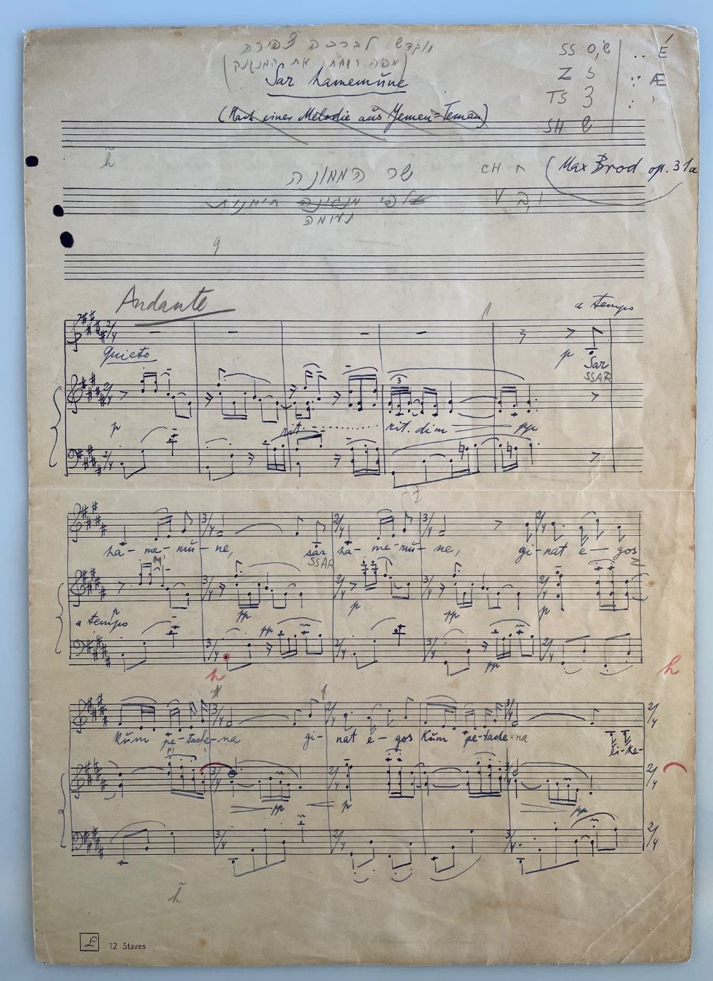 BROD, Max [1884-1968]: Autographmusic manuscript "Sar hamemune" (After a melody from Yemen-Teman) Op. 31a with name in title. No place and date [before 1947] Folio 35 x 25 cm. 3,5 pages on double leaf with 12 staves. Somewhat dusted, crease, small water stain at lower margin. Signs of use.