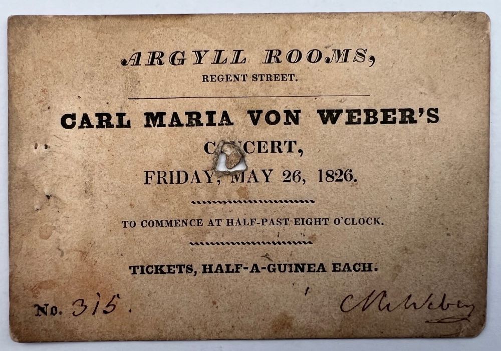 WEBER, Carl Maria von [1786-1826]: Printed entrance ticket: "Argyll Rooms, Regent Street Carl Maria von Webers's Concert, Friday May 26, 1826...No.315" With Weber's autograph signature. London 1826 Sedez 7,5 x 11 cm. With cancellation hole by pliers in the middle.