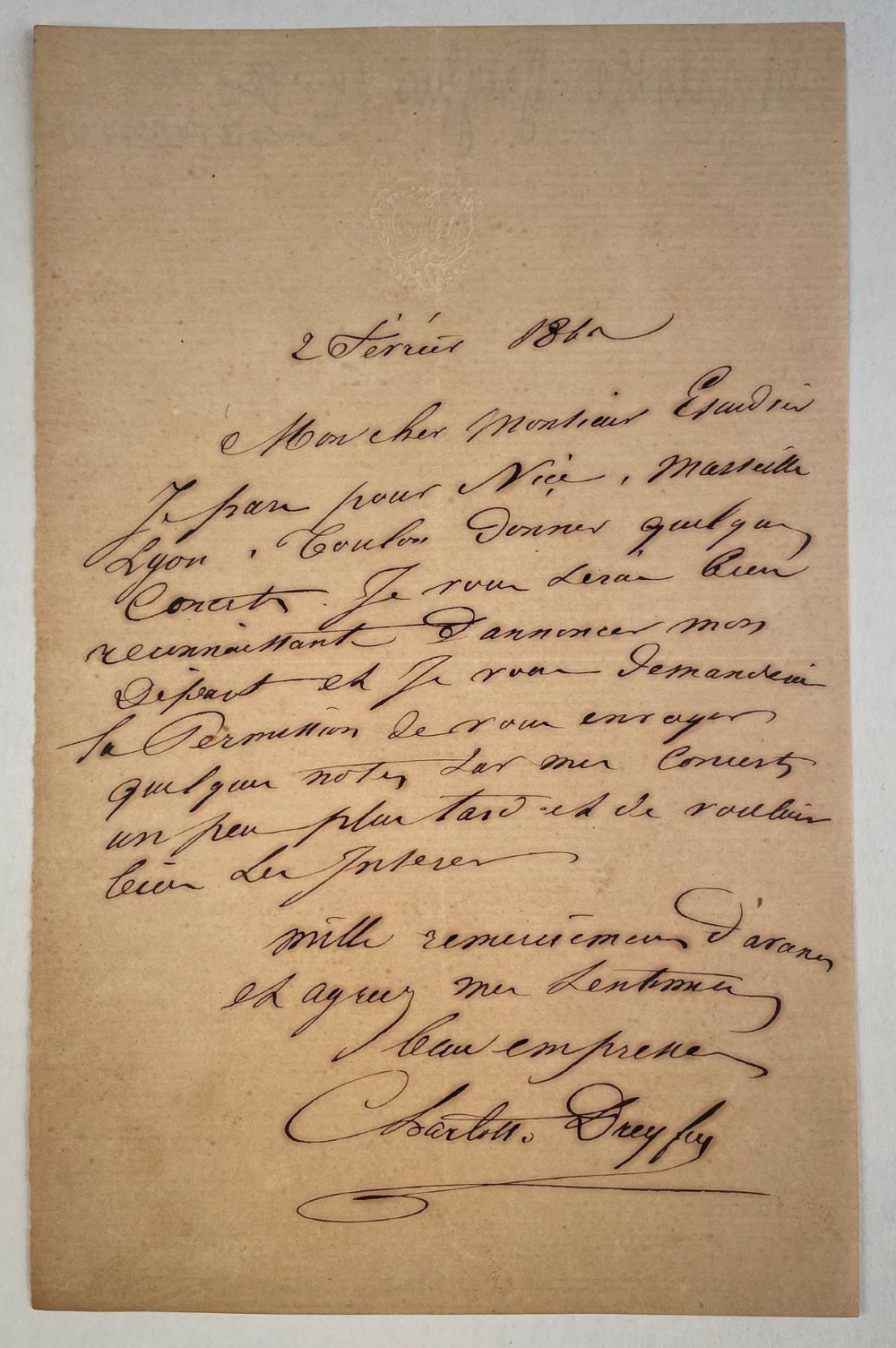 "Mon cher Monsieur Escudier. Je pars pour Nice, Marseille Lyon, Toulon donner quelques Concerts. Je vou serai bien reconnaissant d'annoncer mon départ et Je vous demanderai la Permission de vous envoyer quelque notes sur mes concerts un peu plus tard ... Mille remerciements d'avances et agree mes Sentimens bien empresses Charlotte Dreyfus".